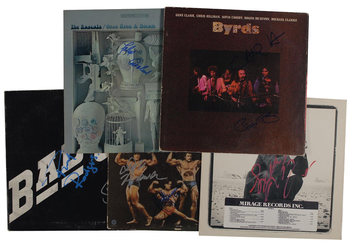 Five albums: The Byrds signed in blue felt tip by Roger McGuinn and Chris Hillman; Bad Co. signed in blue felt tip by Paul Rodgers and silver ink by Simon Kirke; Grand Funk’s All the Girls in the World Beware signed in blue felt tip by Mark Farner and silver ink by Don Brewer; Southside Johnny & The Jukes In the Heat signed in red ink by Southside Johnny; and The Rascals Once Upon a Dream signed in blue felt tip by Felix Cavaliere. In overall very good to fine condition with light creasing, surface wear, ‘ring of wear,’ and a promotional sticker affixed to the Southside Johnny album. The albums are included.