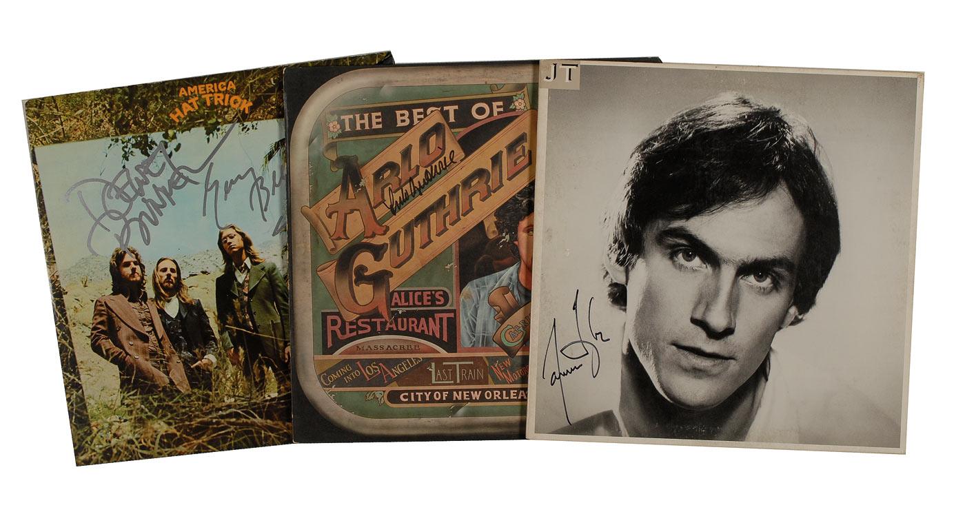 Three albums: America’s Hat Trick signed in silver ink by Dewey Binnell and Gerry Beckley; The Best of Arlo Guthrie signed in black felt tip; and JT signed in black felt tip by James Taylor. In overall very good to fine condition with light creasing, surface wear, ‘ring of wear,’ and a promotional sticker affixed to the Guthrie album. The albums are included.