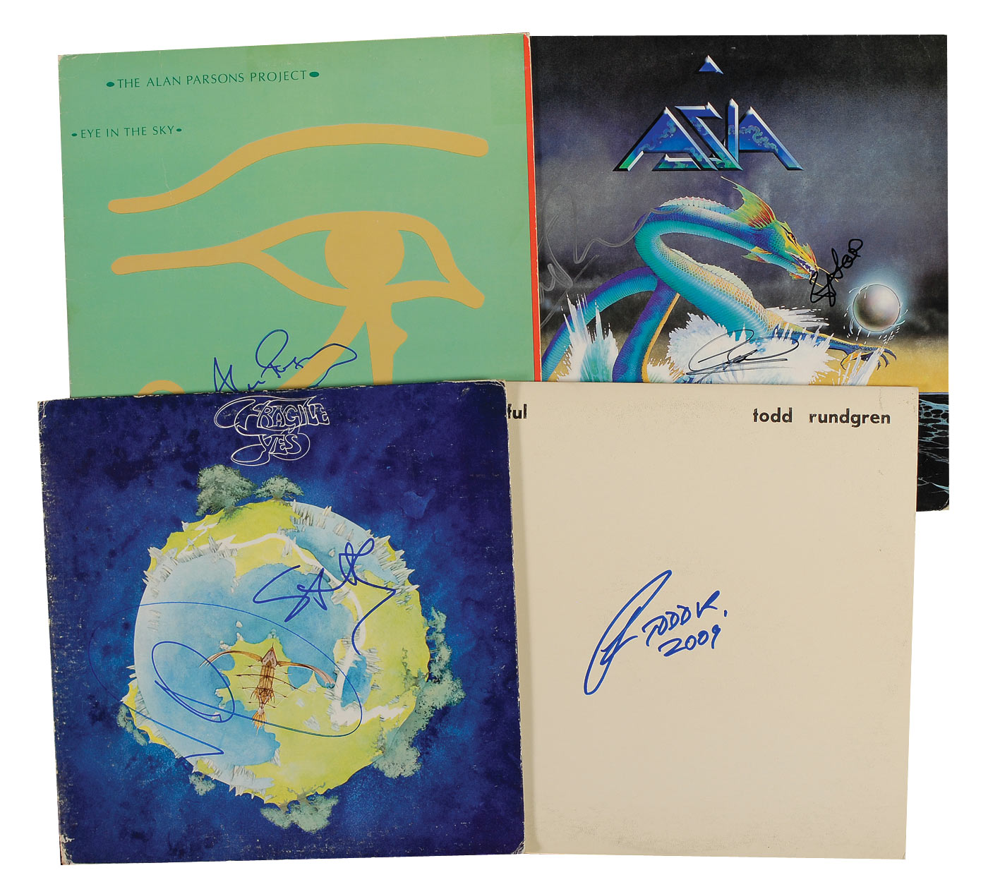 Four signed albums, each signed in ink and felt tip by the respective artists. Signers are: Carl Palmer, Geoff Downes, and Steve Howe (Asia), Alan Parsons (Eye in the Sky), Todd Rundgren (Faithful), and Steve Howe and Jon Anderson (Fragile). In overall fine condition, with scattered creasing and wear, heavier areas of wear to the Fragile album, and light ‘rings of wear’ to all albums. Records are included.