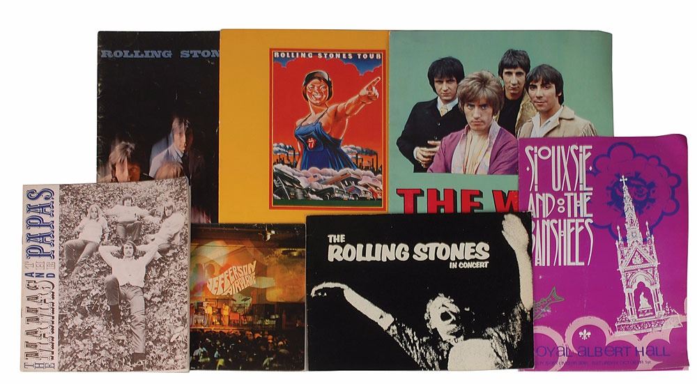 Assemblage of seven vintage classic rock programs, including: a 1966 North American tour program for the Rolling Stones, showing the cover of their fourth studio album; a program for the 1972 Exile US tour of the Rolling Stones; a program for the 1978 US tour of the Rolling Stones; a program for the 1967 US tour of The Who, featuring wonderful “Life-Lines” sections for each member; a program for the 1967 Surrealistic Pillow tour of Jefferson Airplane; a program for the 1966 US tour of The Mamas and the Papas; and a program for two Siouxsie and the Banshees concerts at Royal Albert Hall on September 30 and October 1, 1983, opening up to a color 27 x 18 poster (from the Robert Smith period). In overall very good to fine condition.