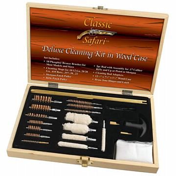 Classic Safari Deluxe Cleaning Kit in Wood Case **|**|** This set features 10 phosphor bronze brushes for cleaning 10/12 Ga, 20/28 Ga, .410 bore, .44/.45, .357/.38/9mm, .30, .40/10mm, .22, .17, and .270/.280; 5 cleaning mops for 10/12 Ga, 20/28 Ga, .410 bore, .357/.38, and .22; shotgun patch puller; and rifle patch puller. Includes a 3pc rod with assembly for .17 caliber rifle and up, pistol or shotgun. Cleaning rod adapters included. All enclosed in a 12-1/8" x 7-3/4" x 1-5/8" wood case with brass-tone hinges and latch.