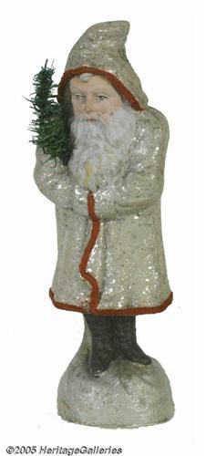 <B>Classic Santa Candy Container in a Large Size</B></I> This candy container portrays the wise old man in a white sparkled coat holding a tree. Here Santa separates at his legs to expose the hidden candy prize. The lower part of this container, including his legs and base, have at some point been filled with plaster of paris so the empty top portion won't fall over from being too top heavy. Santa's kindly face is accentuated by the red piping that lines his hat and continues around his coat. Only minor surface wear and filled bottom keep this from being a perfect representation. His appearance is fantastic! Lot:252