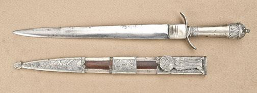 Classic South American goucho-type knife, probably from Argentina. Fancy engraved silver alloy grip and mounts, 19th century type blade with reinforced ricasso measuring approx. 12”, 17-3/4” overall, nicelyengraved, blade lightly polished and shows sharpening and is generally good. A good older piece and not a tourist item. There is some minor dents in the hollow silver grip. Est: $400 - $800