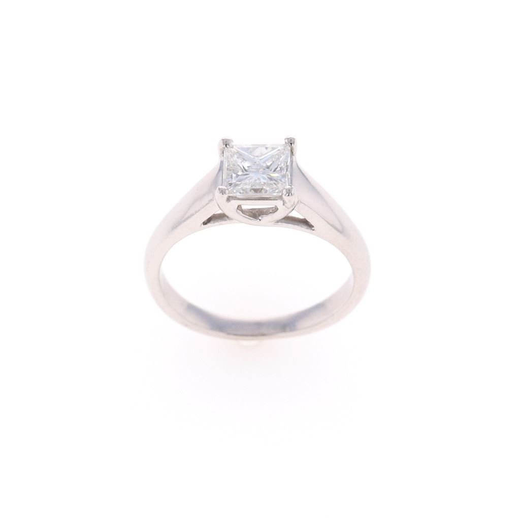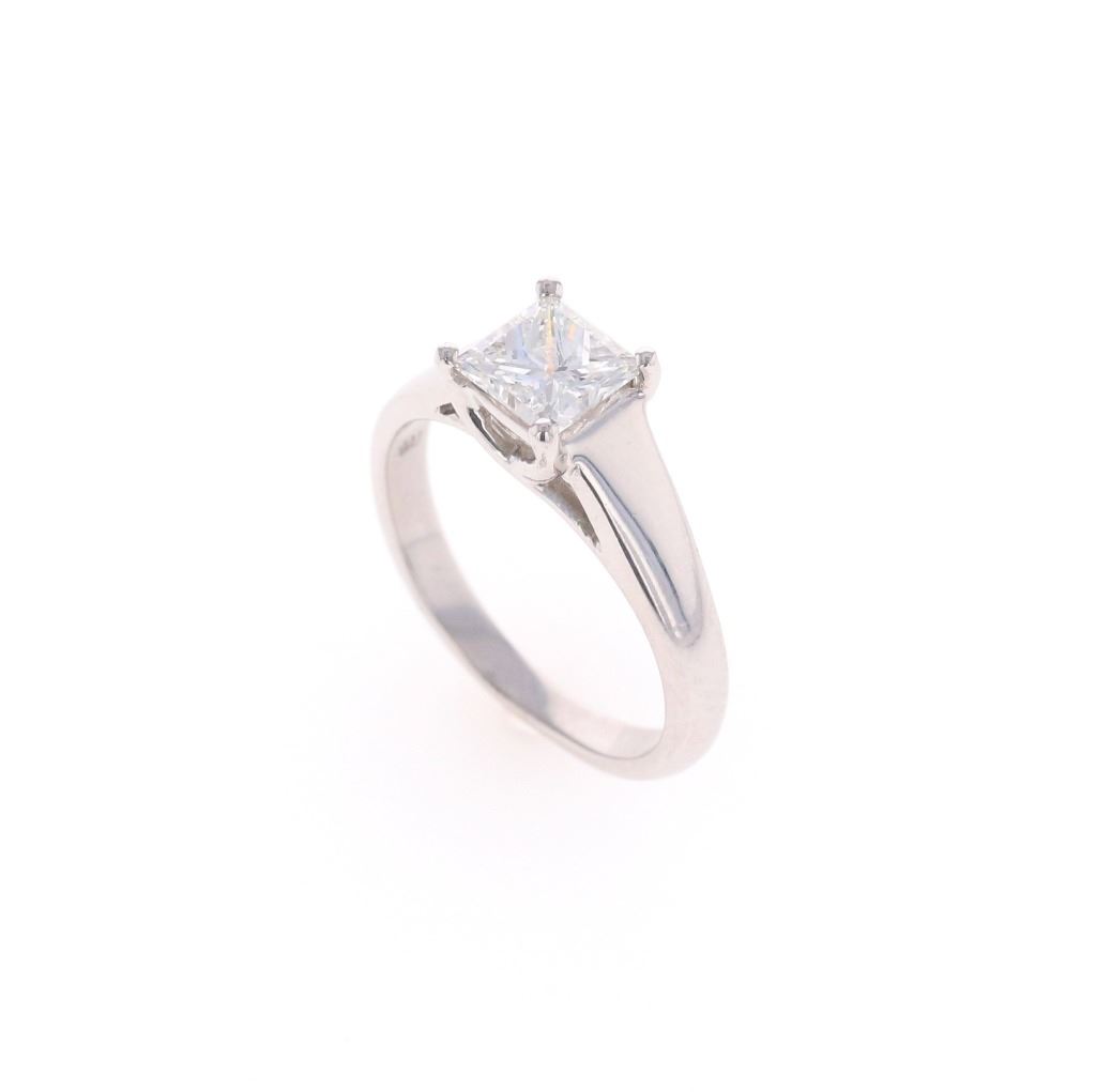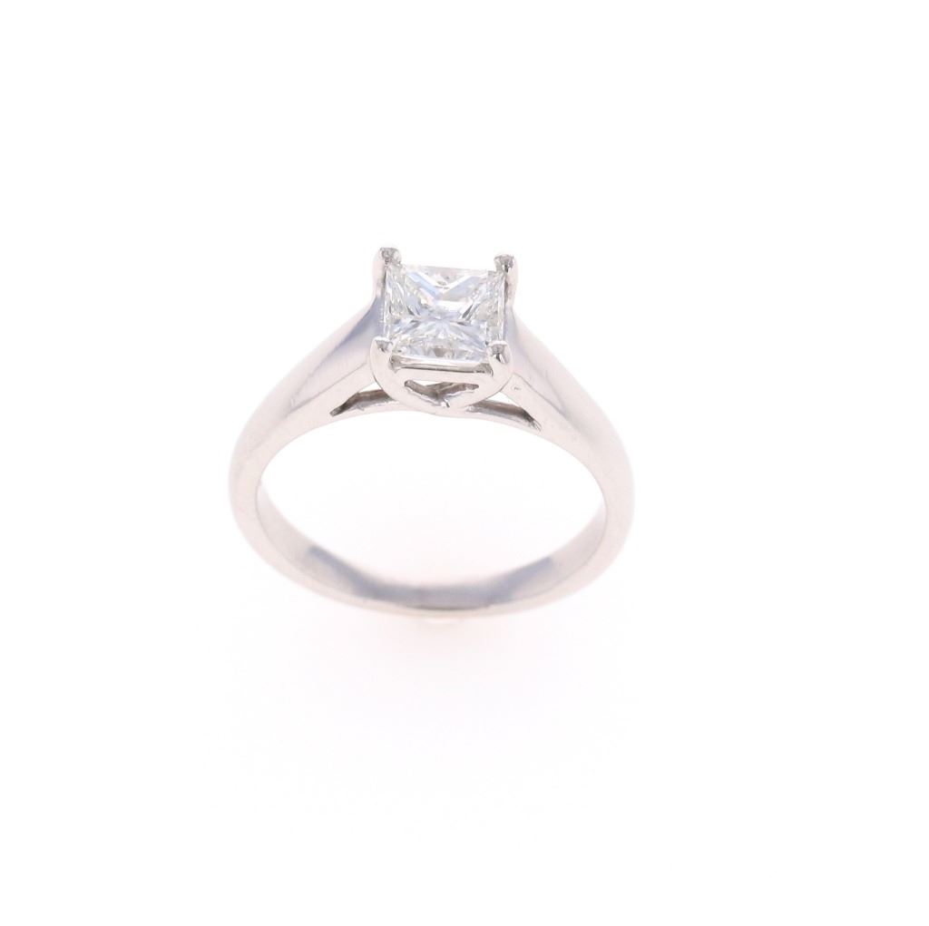 This is a truly wonderful classic and satisfyingly simple solitaire ring with polished platinum setting holding a single square cut natural diamond with 1.08 carat weight, accompanied by AIGL paperwork. The center stone is 1.08 carats in weight, G in color, and SI2 in clarity. Overall has a weight of 6.0 grams and is in a size of 6 US. The piece is stamped PLAT as well as a makers mark and is a wonderful vintage estate example in prisitine, like new condition. Accompanied by AIGL (American International Gemological Laboratories, INC., a GIA graduate gemologists # K65D95-EA1734) gemology report and appraisal which confirms the above info and gives a value of $12,860.00.