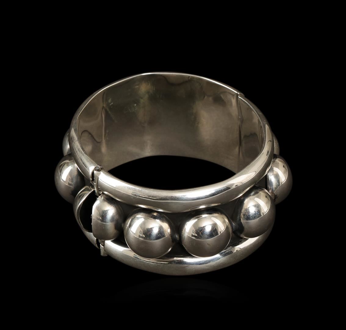 One of a kind high fashion sterling silver bracelet weighing 109.2 grams. This sterling silver promises a lasting shine.