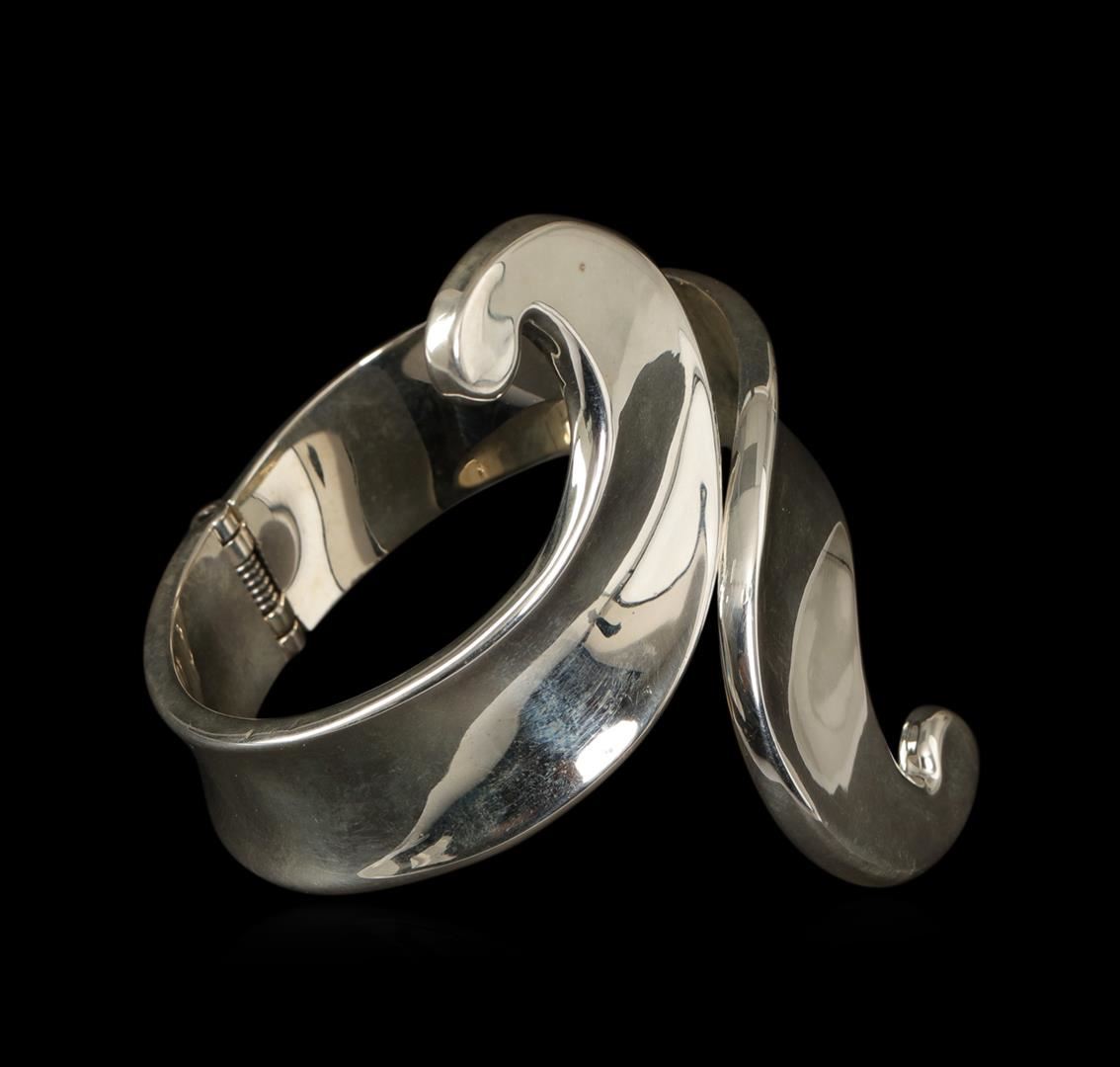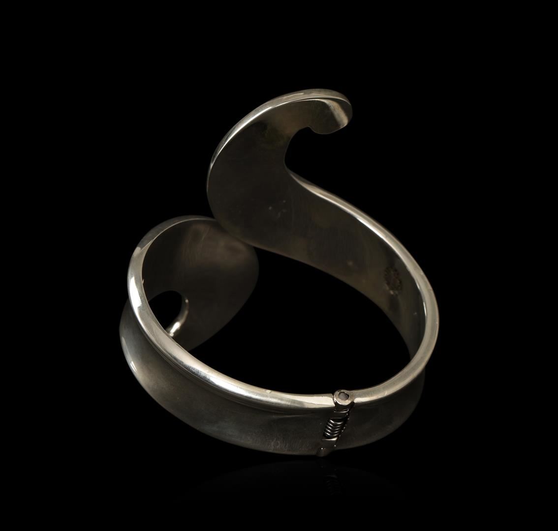 One of a kind high fashion sterling silver bracelet weighing 58.3 grams. This sterling silver promises a lasting shine.