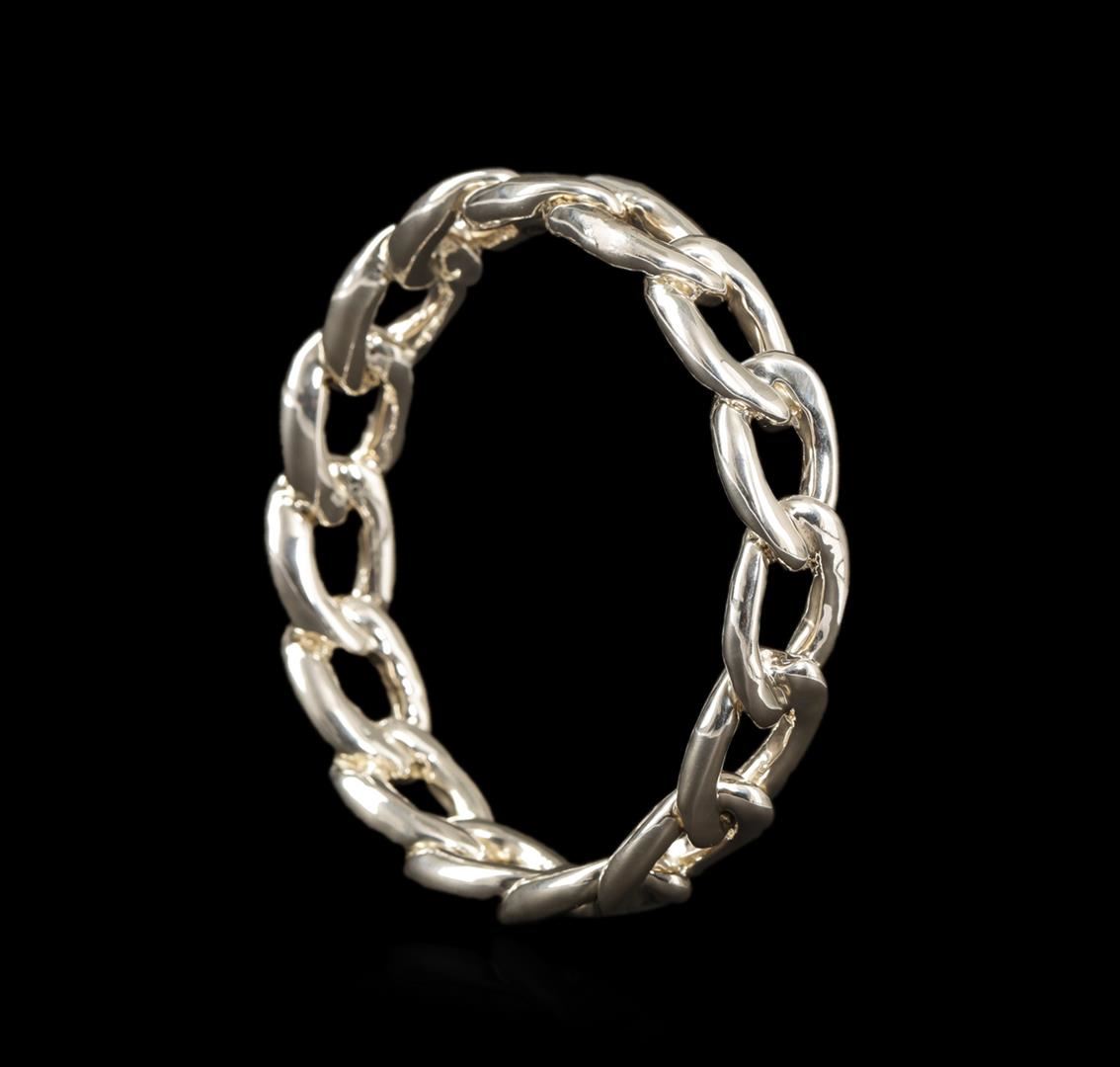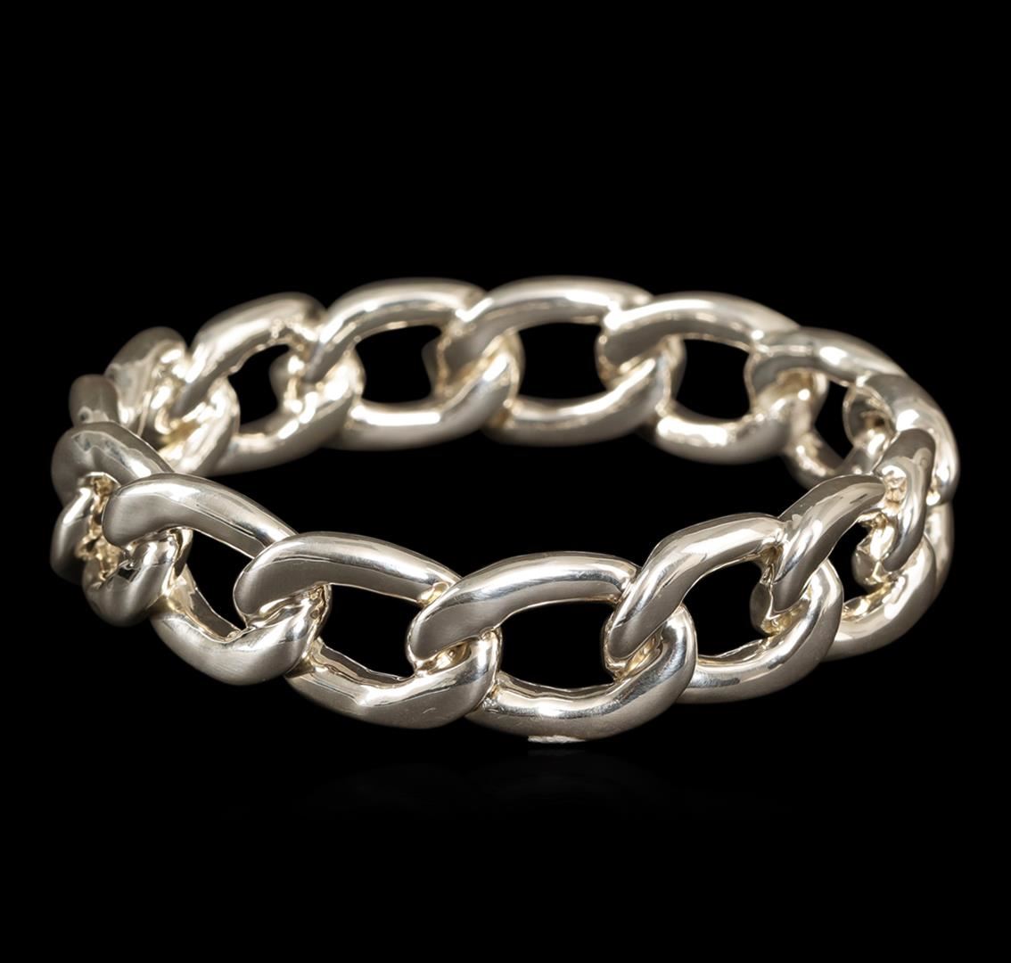 One of a kind high fashion sterling silver bracelet weighing 43.8 grams. This sterling silver promises a lasting shine.