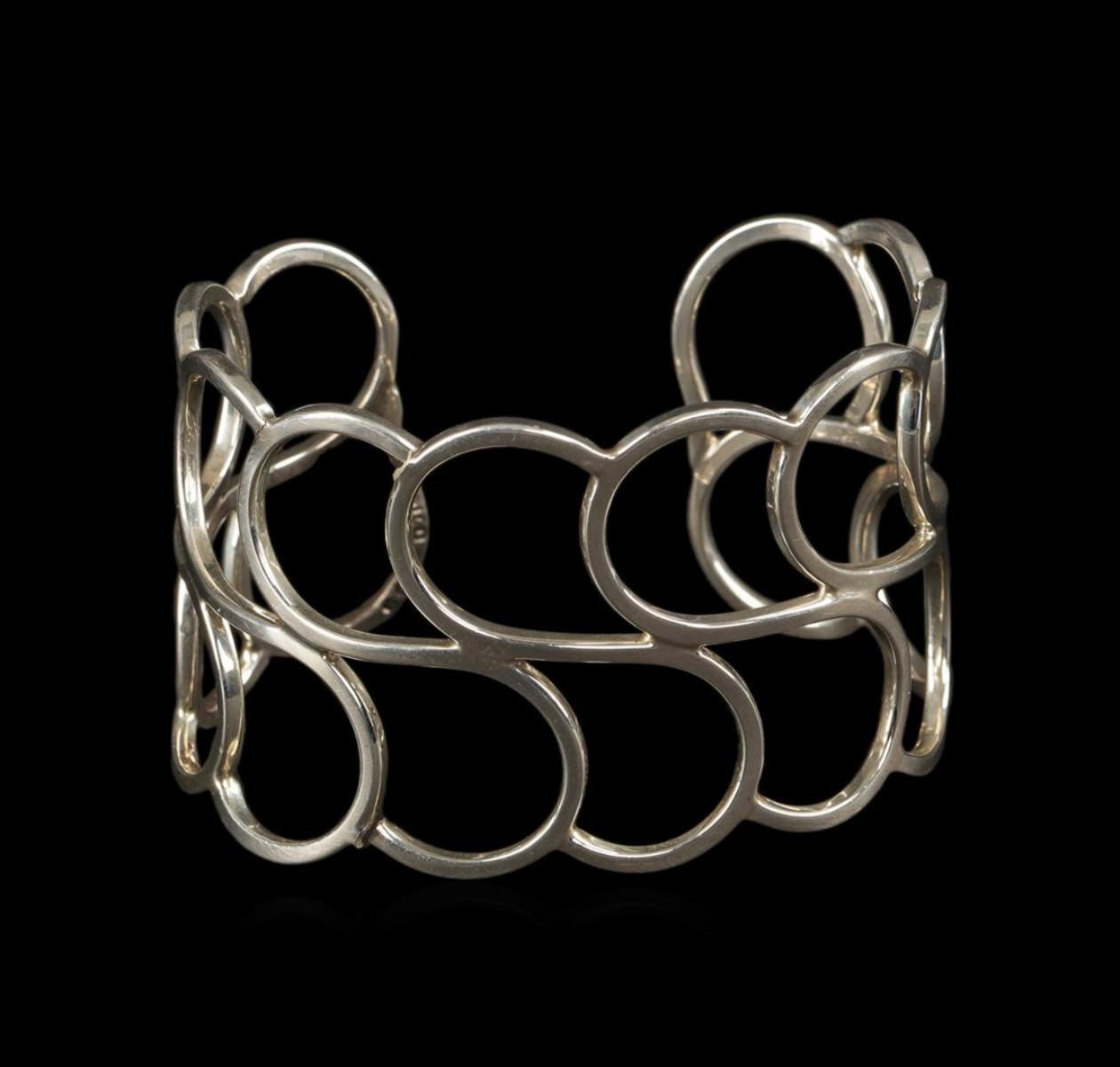 One of a kind high fashion sterling silver cuff bracelet weighing 34.5 grams. This sterling silver promises a lasting shine.