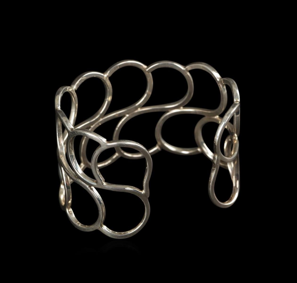 One of a kind high fashion sterling silver cuff bracelet weighing 34.5 grams. This sterling silver promises a lasting shine.