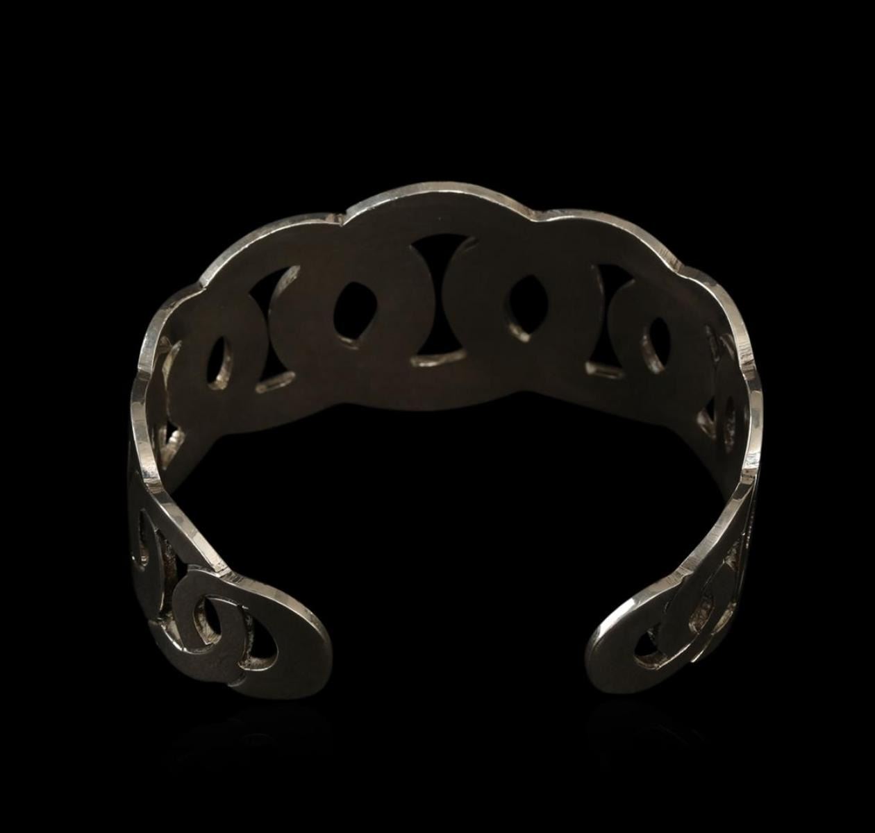 One of a kind high fashion sterling silver cuff bracelet weighing 73.4 grams. This sterling silver promises a lasting shine.