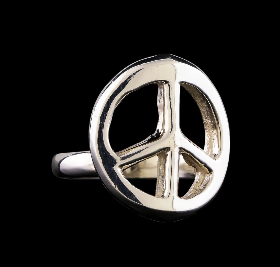 One of a kind high fashion sterling silver peace ring weighing 7.8 grams. This sterling silver promises a lasting shine.