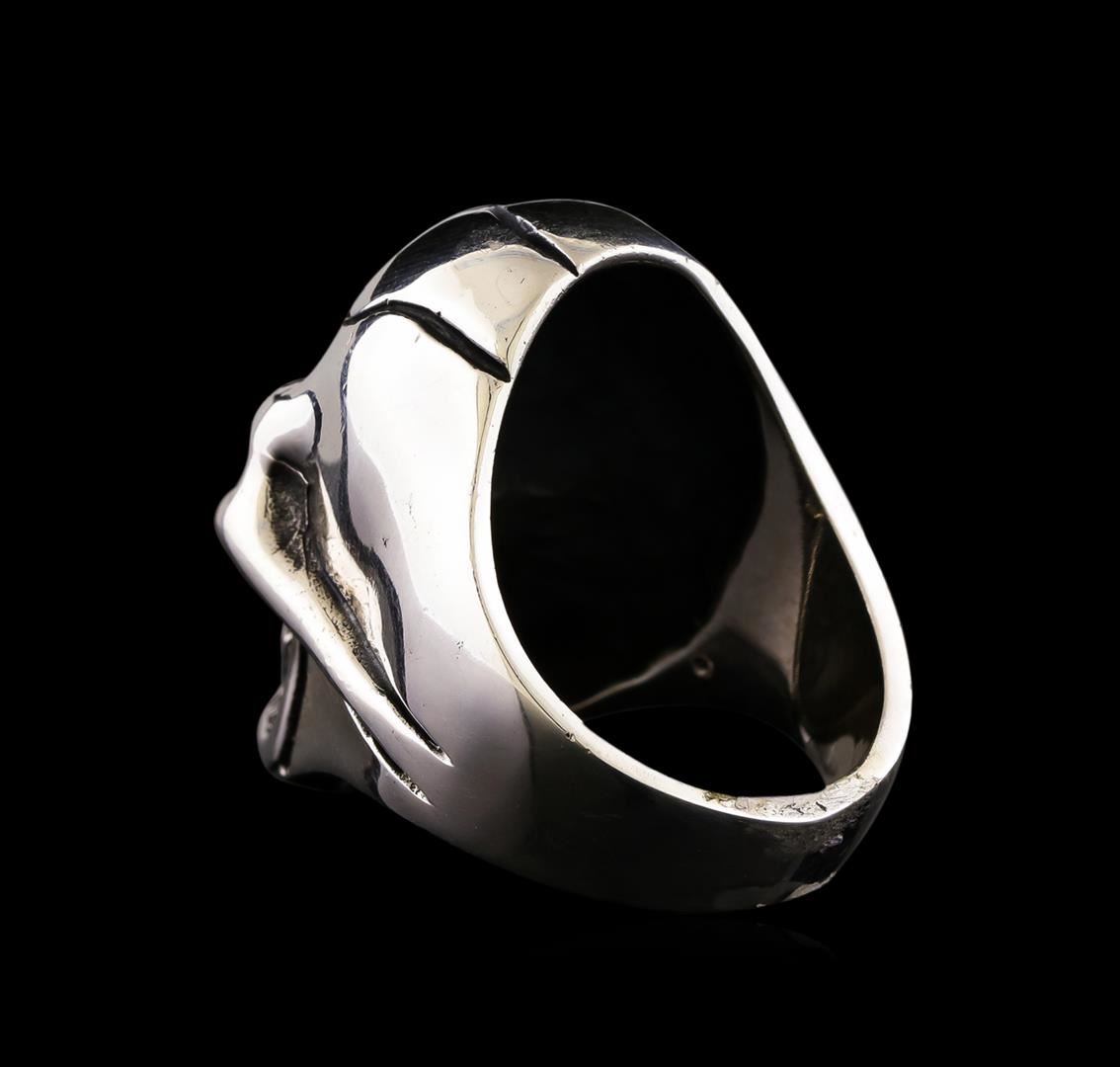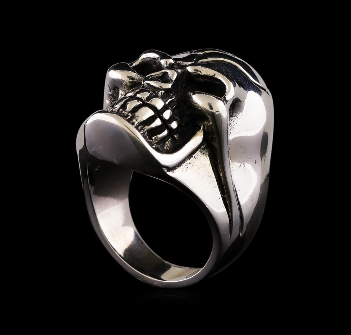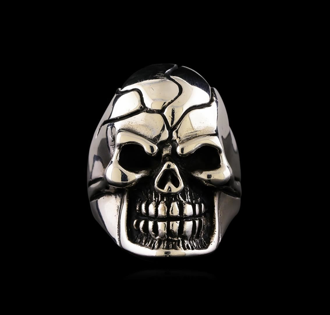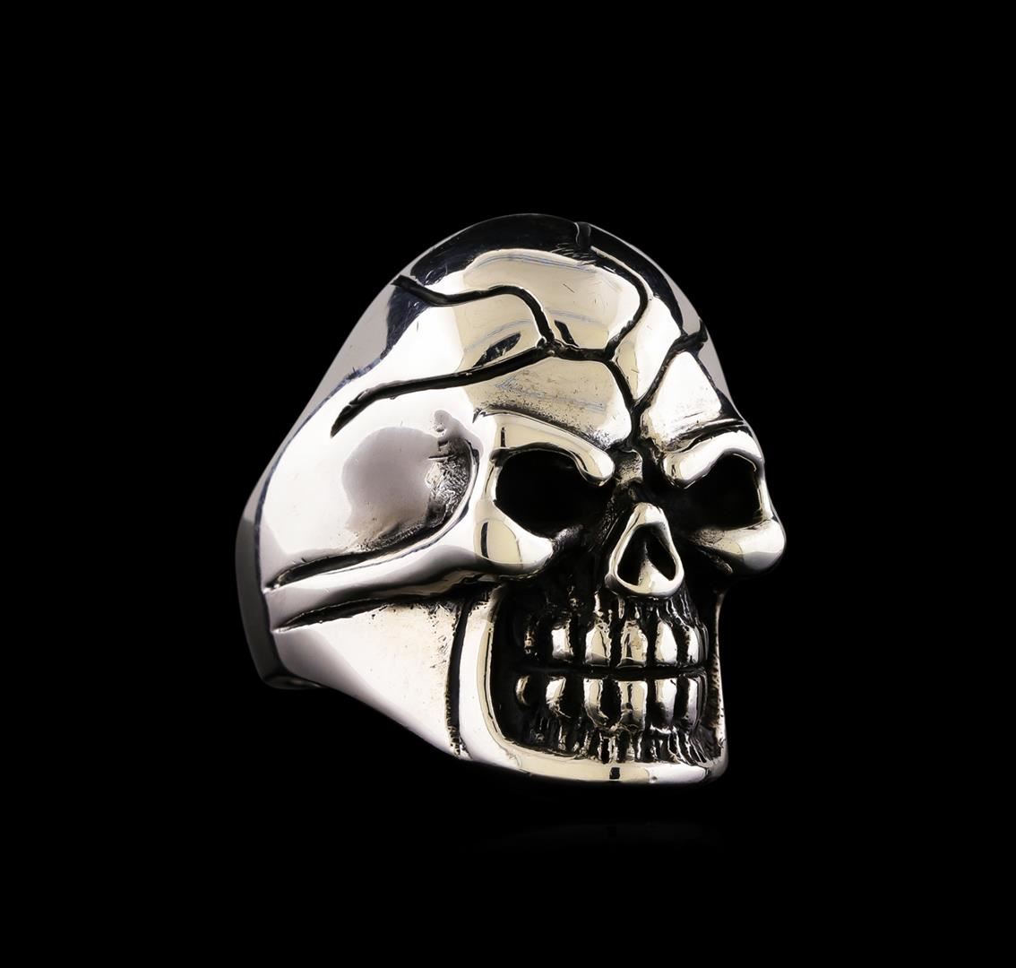 One of a kind high fashion sterling silver skull ring weighing 31.3 grams. This sterling silver promises a lasting shine.