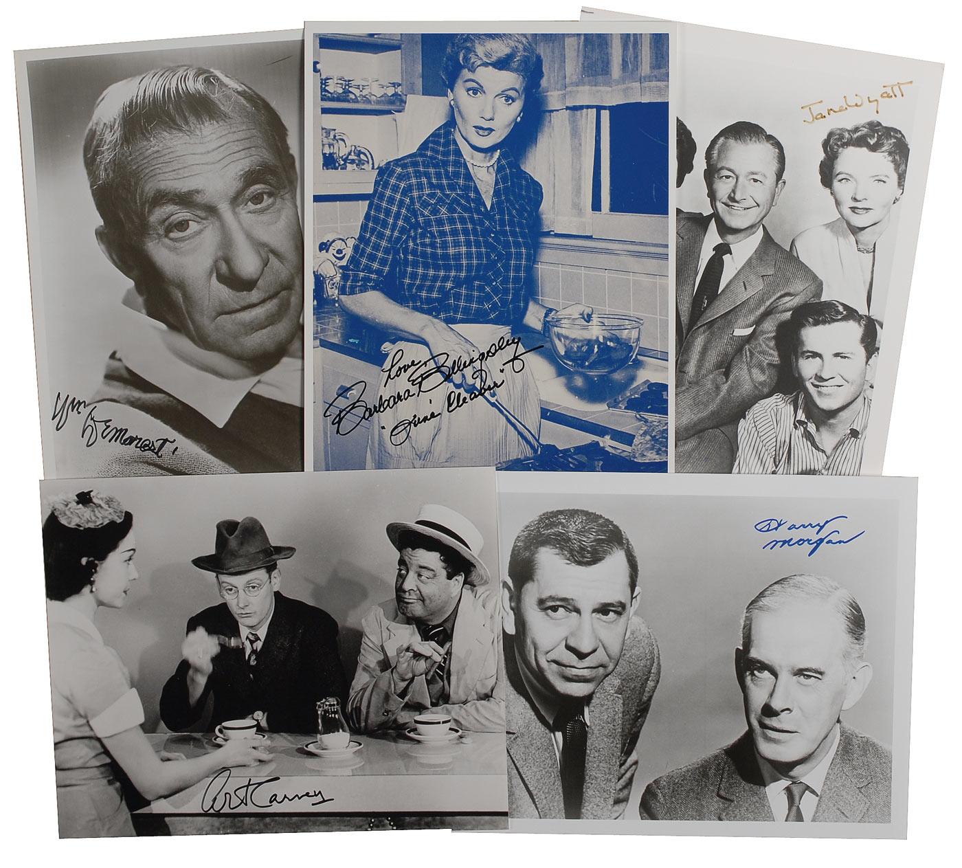Five glossy photos, three 8 x 10 and two 10 x 8, each signed in felt tip by the respective actor or actress pictured. Signers are: Harry Morgan, Art Carney, Jane Wyatt, Barbara Billingsley, and William DeMarest. In fine overall condition.