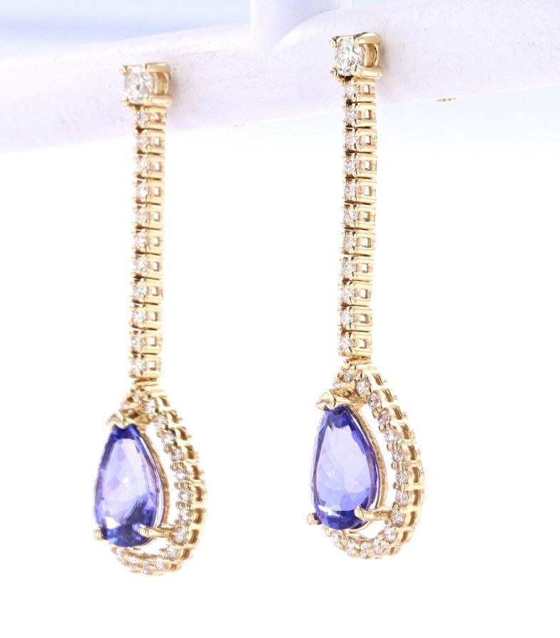 This is a wonderful pair of classic tanzanite and diamond, 14k yellow gold dangle earrings with GIA and IAS paperwork. The earrings show a 14k stamped yellow gold frame with an overall weight of 4.30gm; it also shows two centered, classic pear cut tanzanite stones with fine medium blue color and an overall weight of 2.61 carats. The earrings show a profusely decorated dangle design with 68 total round brilliant cut diamonds set into the dangle and around the pear shape stone; the diamonds have G - H color and VS2/ SI1 clarity with an overall weight of 0.61 carats. The piece comes complete with IAS (Independent Appraisals Services a GIA certified lab IAS#: 32220EW) report and appraisal, confirming the above info and giving a total value of $8710.00.
