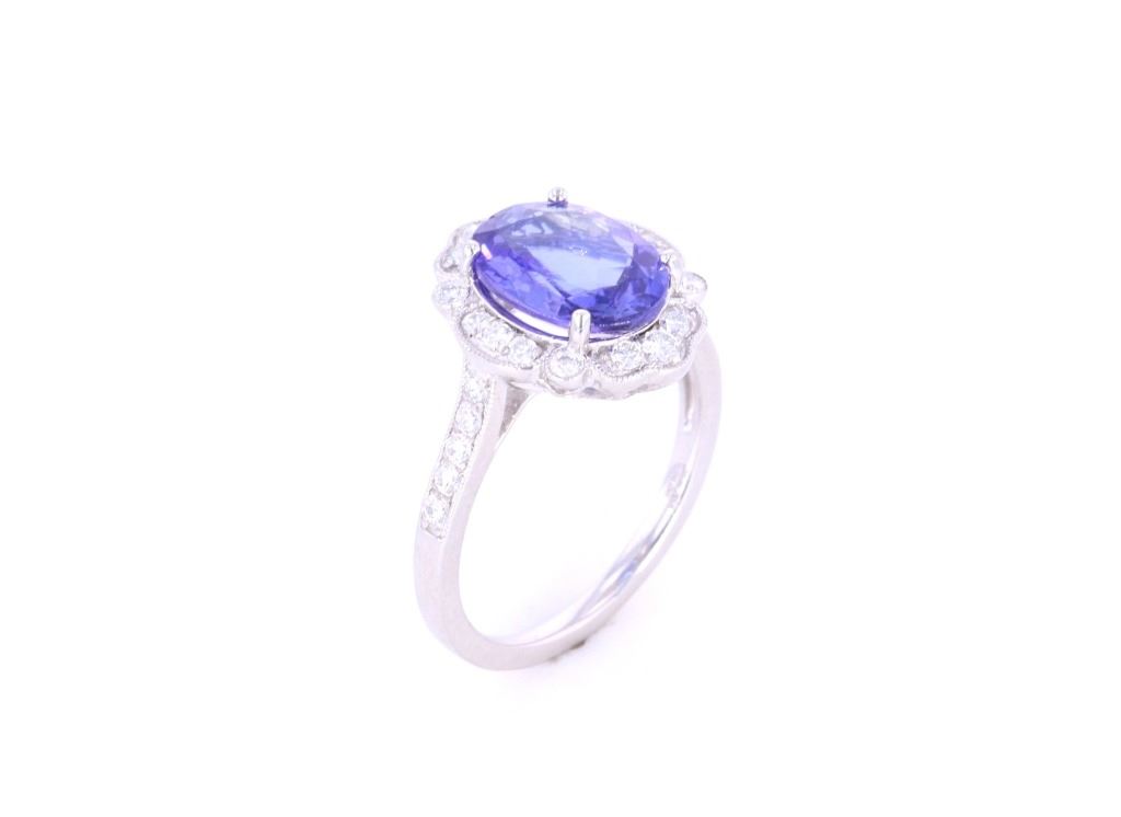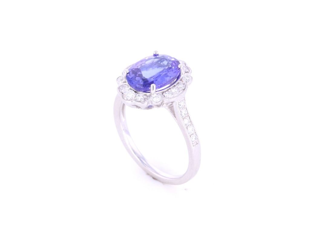 Featured in this classic tanzanite diamond ring with AIGL and GIA paperwork. The ring shows a polished, stamped and tested platinum ring with a bright finish and in new condition with excellent workmanship with 'Orianne' hallmark with a 'PT950' stamp next to it. The center stone shows modified brilliant cut oval tanzanite with measurements of 10.8mm x 8.1mm x 4.6mm with violetish blue coloration and very good cut grade with a weight of 3.07cts. The center stone is decorated with floral style halo ring and pave shoulders with 26 round brilliant cut diamonds with measurements of 1.5mm - 2.0mm with a clarity grade of VS1 - VS2 and a color gradient of G - H and a collective weight of 0.43cts. Tanzanite is a very rare precious gemstone that is only found in the Usumburu Mountains that border the Umba Valley of northern Tanzania. It was originally discovered in 1967 by Tiffany & Company, who named the stone Tanzanite. This example is unique due to its exceptional pleochroism (an optical phenomenon in which a stone has different colors when observed at different angles). The ring size is US 7. The piece comes complete with AIGL Inc.(American International Gemological Laboratories, Inc. a GIA certified lab AIGL#: K34E52-EA14885) report and appraisal confirming the above info and giving a total value of $8,630.00.