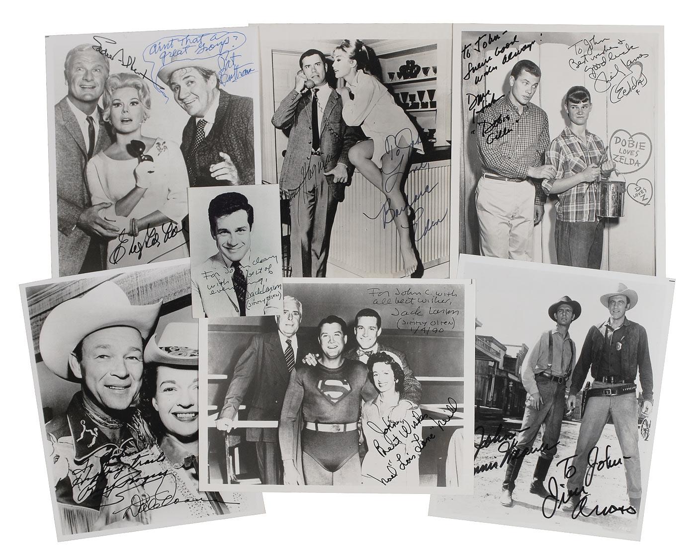 Six glossy 8 x 10 or 10 x 8 photos and one 3.25 x 5 photo, each signed in ink by the respective actor(s) pictured. Signers are: Eddie Albert/Eva Gabor/Pat Buttram (adding “Ain’t that a great group?”), James Arness/Dennis Weaver (both ins), Roy Rogers (ins)/Dale Evans, Dwayne Hickman/Sheila James (both ins. and adding their character names), Larry Hagman/Barbara Eden (ins), Jack Larsen (ins and adding “Jimmy Olsen”), and Jack Larsen/Noel Neill (both ins and adding their character names). In overall fine condition.