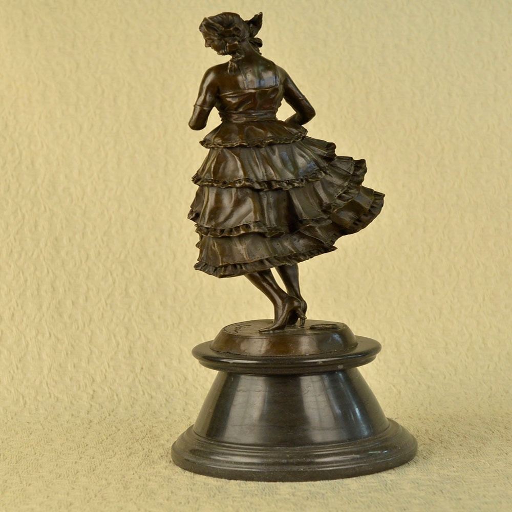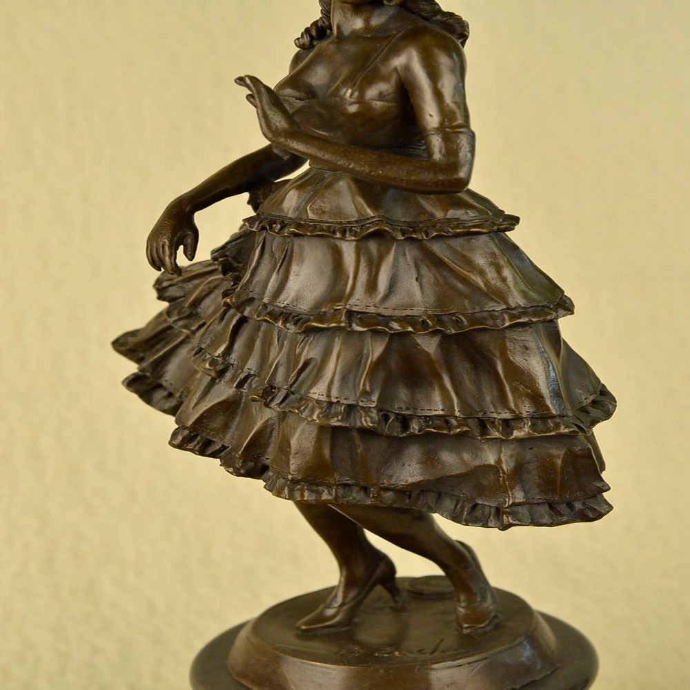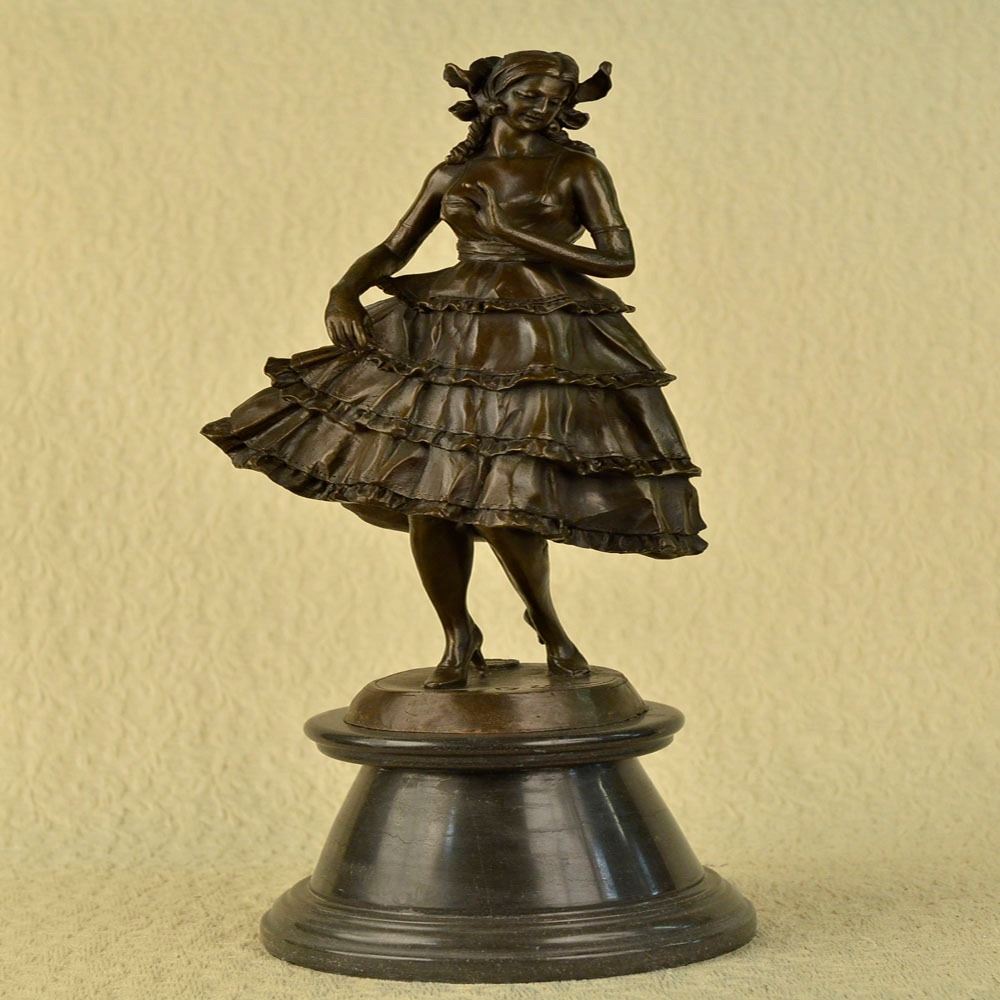 This is a captivating Bronze study of the beautiful young classic dancer. When you look over the Sculpture and the depth and warmth of the patina meet your eye, it sends a sense of calmness and gracefulness. Its almost as if the Sculpture is a picture of a lullaby in still motion. She points her left foot toe, carefully and gracefully she tUrns her body, even her fingers are positioned in a polite manner, as she tiptoes on her right foot. Her beautifully proportioned body is accented by the dress she wears. Creasing with gravity and fluid movement, the skirt is wide and flowing at the hips giving nice dimension to the her. Her face has delicate features, with full lips, a cute small nose, and wide innocent accepting eye. This Sculpture was cast using the Lost Wax Method and has a brown patina finish. She is mounted on a marble base. Bronze Dimensions with Marble Base: Height 20 X Width 8 inches. Weight: 20 LBS.