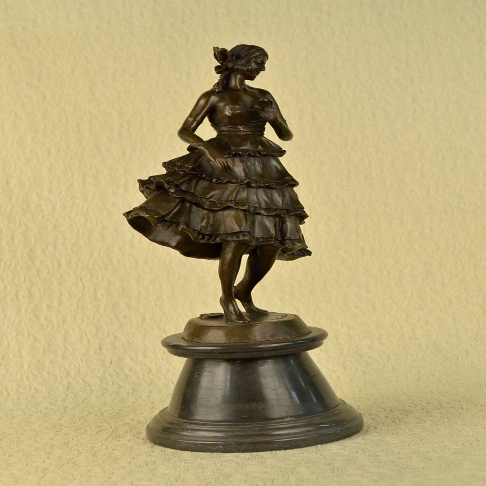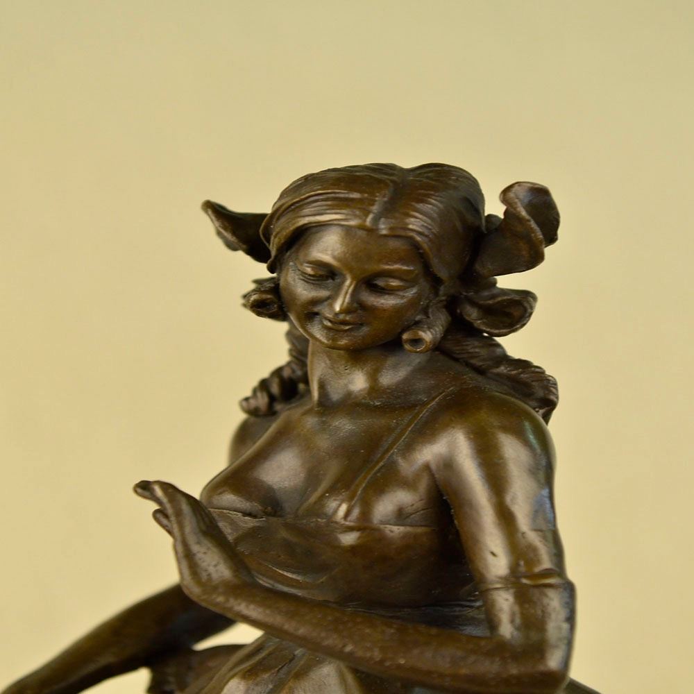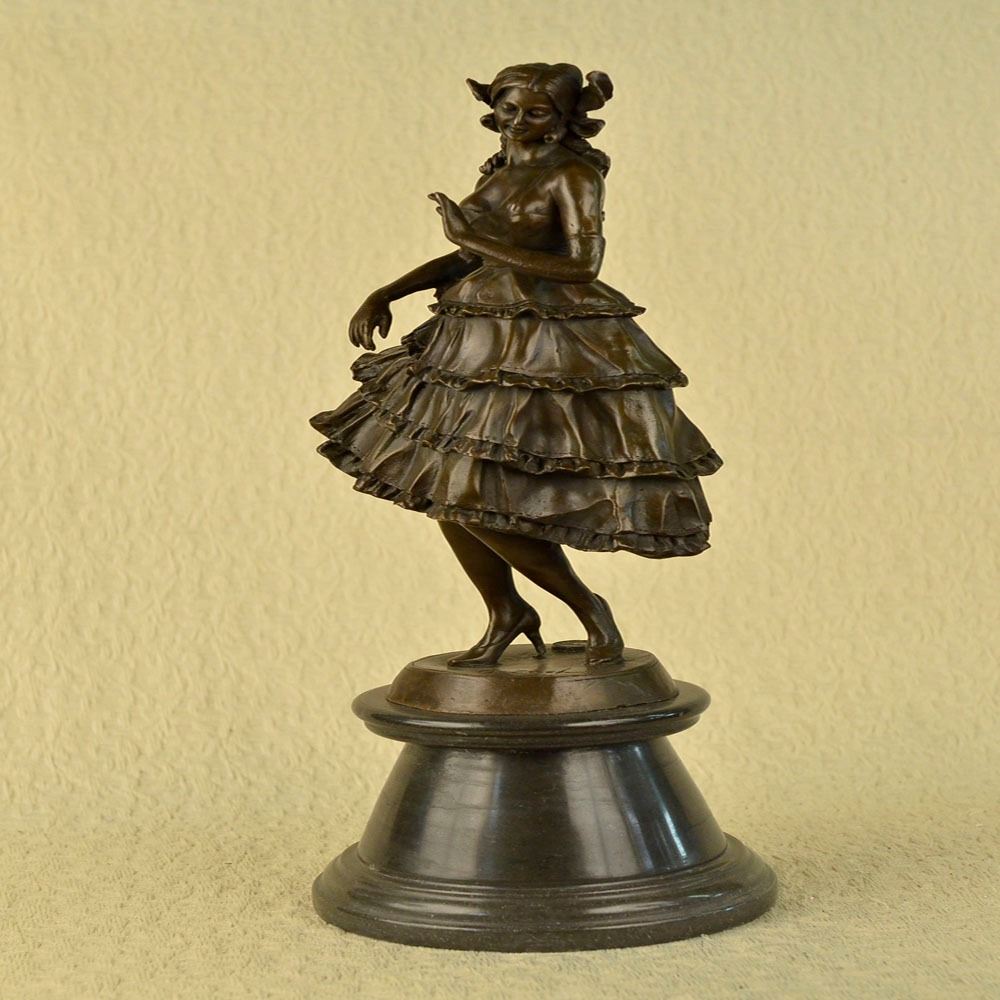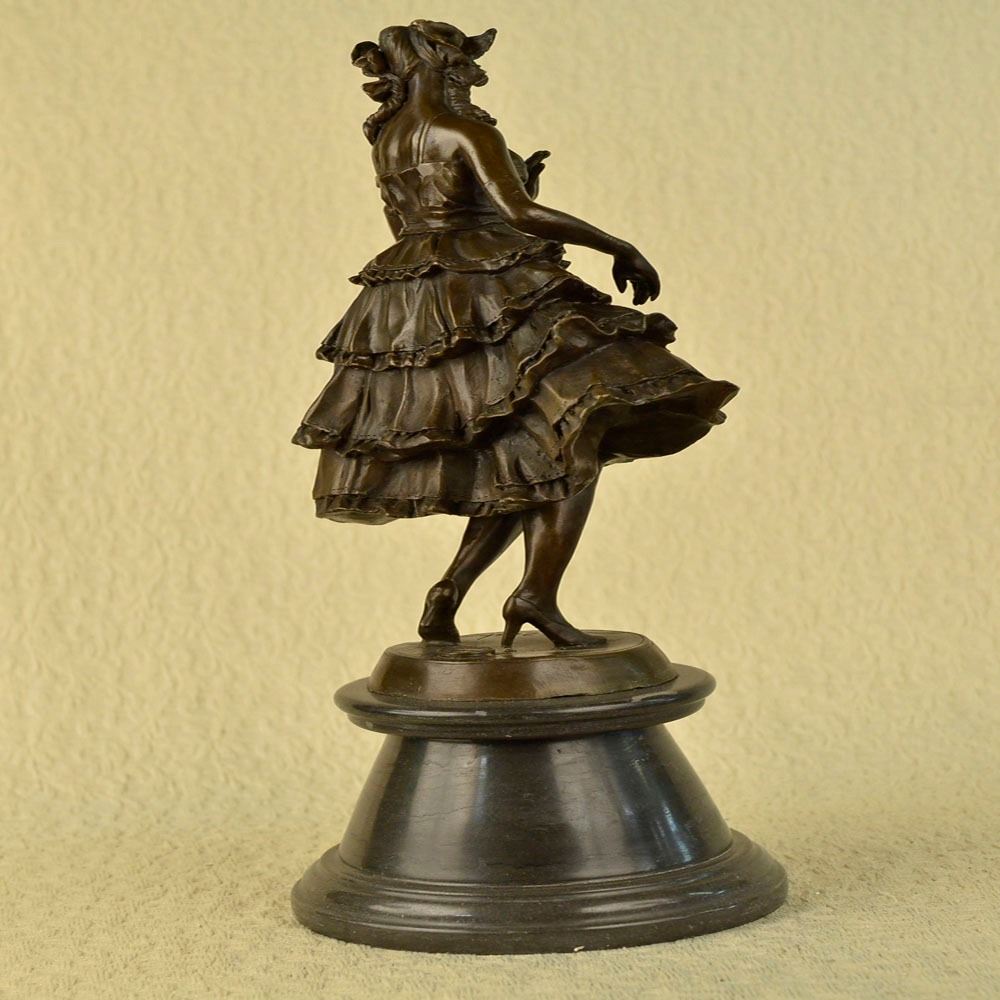 This is a captivating Bronze study of the beautiful young classic dancer. When you look over the Sculpture and the depth and warmth of the patina meet your eye, it sends a sense of calmness and gracefulness. Its almost as if the Sculpture is a picture of a lullaby in still motion. She points her left foot toe, carefully and gracefully she tUrns her body, even her fingers are positioned in a polite manner, as she tiptoes on her right foot. Her beautifully proportioned body is accented by the dress she wears. Creasing with gravity and fluid movement, the skirt is wide and flowing at the hips giving nice dimension to the her. Her face has delicate features, with full lips, a cute small nose, and wide innocent accepting eye. This Sculpture was cast using the Lost Wax Method and has a brown patina finish. She is mounted on a marble base. Bronze Dimensions with Marble Base: Height 20 X Width 8 inches. Weight: 20 LBS.