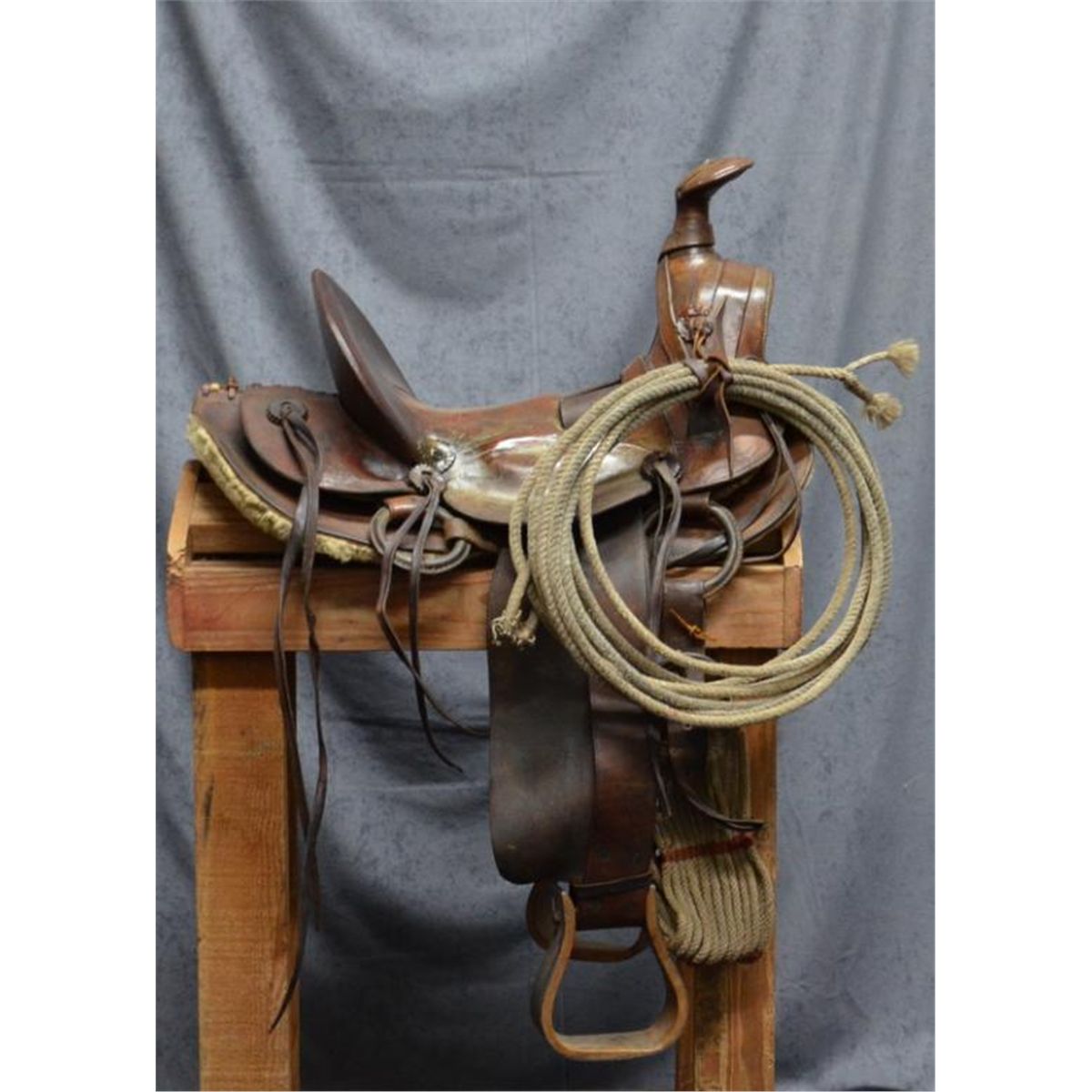 Classic Western high back saddle in overall good condition showing re-covering of rear cantle, no visible maker’s marks, metal lined wood stirrups; lariat rope included; a great decorator for the Western theme or tackroom. Est.: $250-$500.