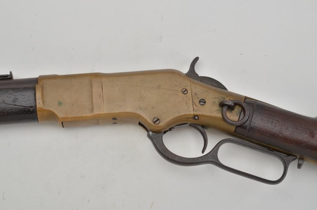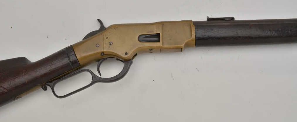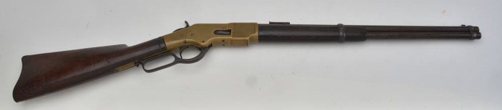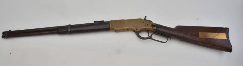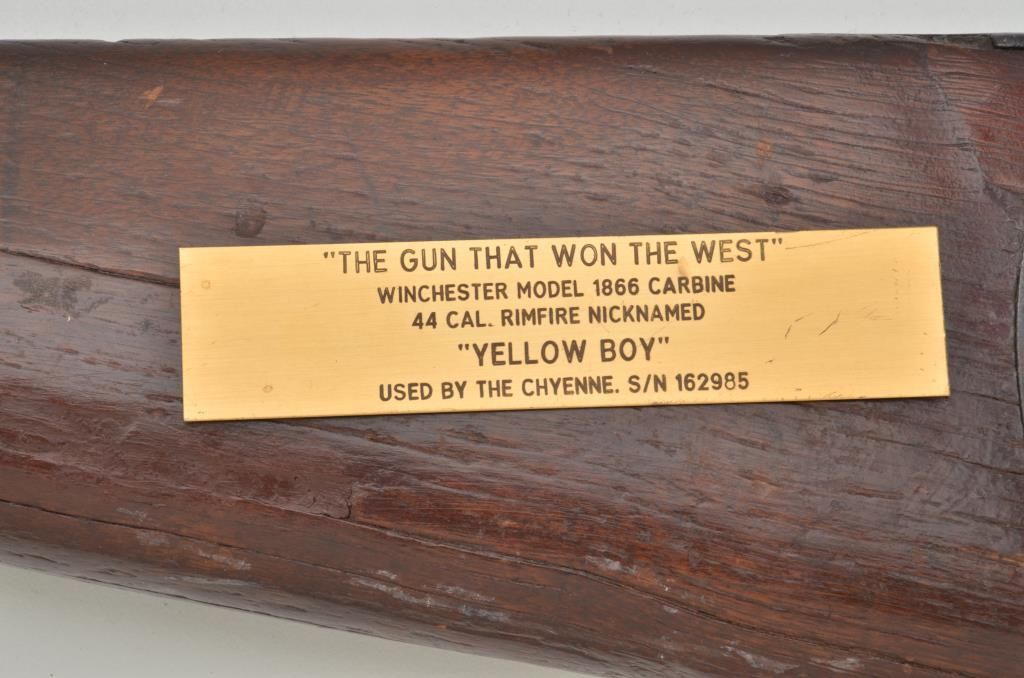 Classic Winchester Model 1866 lever action SRC, .44 cal., 20” barrel, brass frame, wood stocks, #162985. This gun has a great uncleaned and well-worn frontier look showing a heavy dark patina on the barrelassembly with a beautiful patina to the brass frame; good action, dark bore, wood stocks are weathered and shows years of dutiful service; left side of butt stock displays a plaque that reads “THE GUN THAT WON THE WEST” Winchester Model 1866 Carbine .44 cal. rimfire nicknamed “YELLOW BOY” Used by the Cheyenne S/N 162985. Could be proudly displayed in any gunroom or collector’s office or den. Est.: $1,500-$3,000.