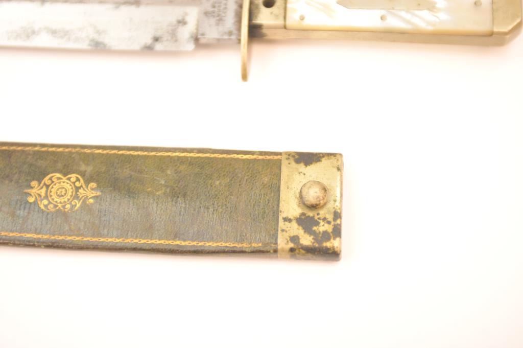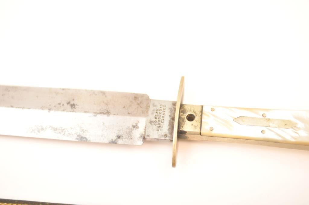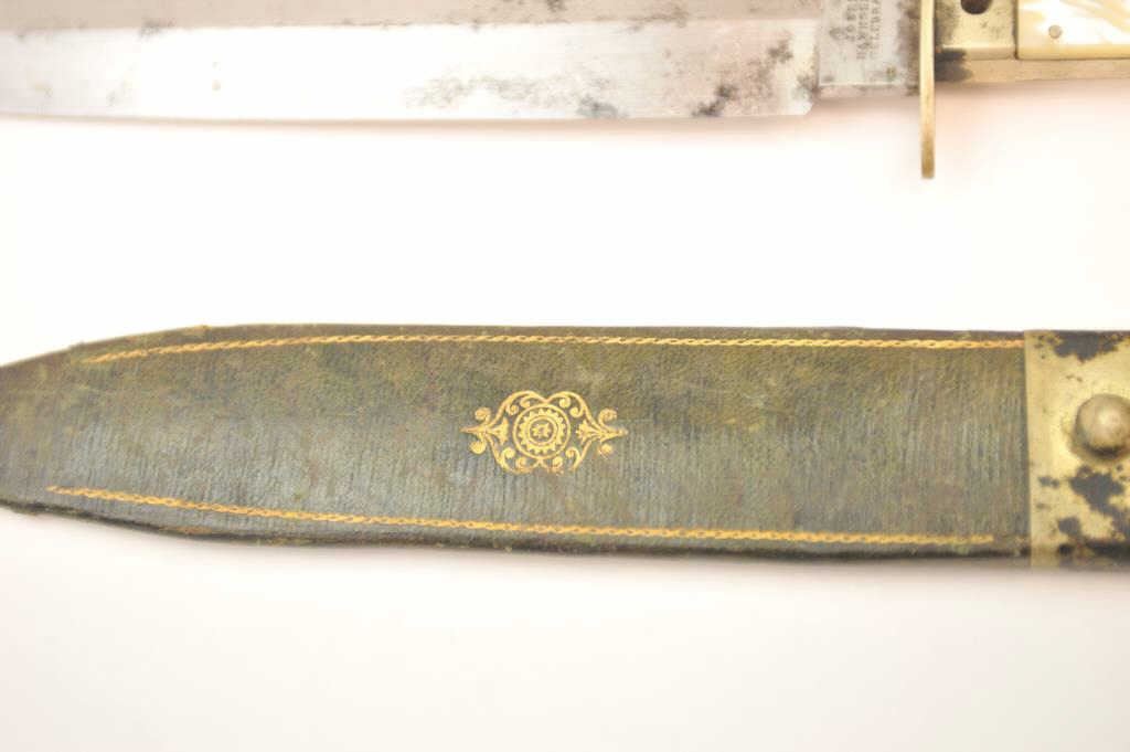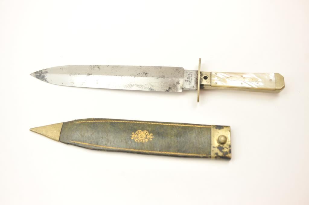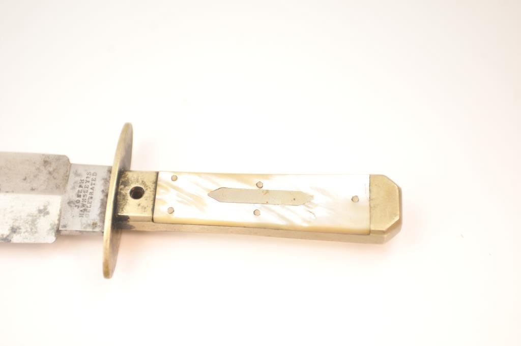 Classic and large spear point Bowie knife marked, “Joseph Hawksley’s Celebrated” with semi-coffin shaped grip with pearl scales and German silver mountings. Original scabbard with tip, throat and button hanger. Theblade measures 9 ¾” and the knife is 14 ¼” overall. The blade measures 1 ½” wide at the thickest point and is finely ground from thick stock. The blade is good to very good with scattered erosion and minor pitting butfull original dimensions with considerable original polish. The scabbard is also good to very good with minor aging. The pearl scales are near fine. There is a hole through the front bolster behind the guardfor a lanyard loop. A classic and high quality knife circa 1850-1870. Est.: $1,400-2,800
