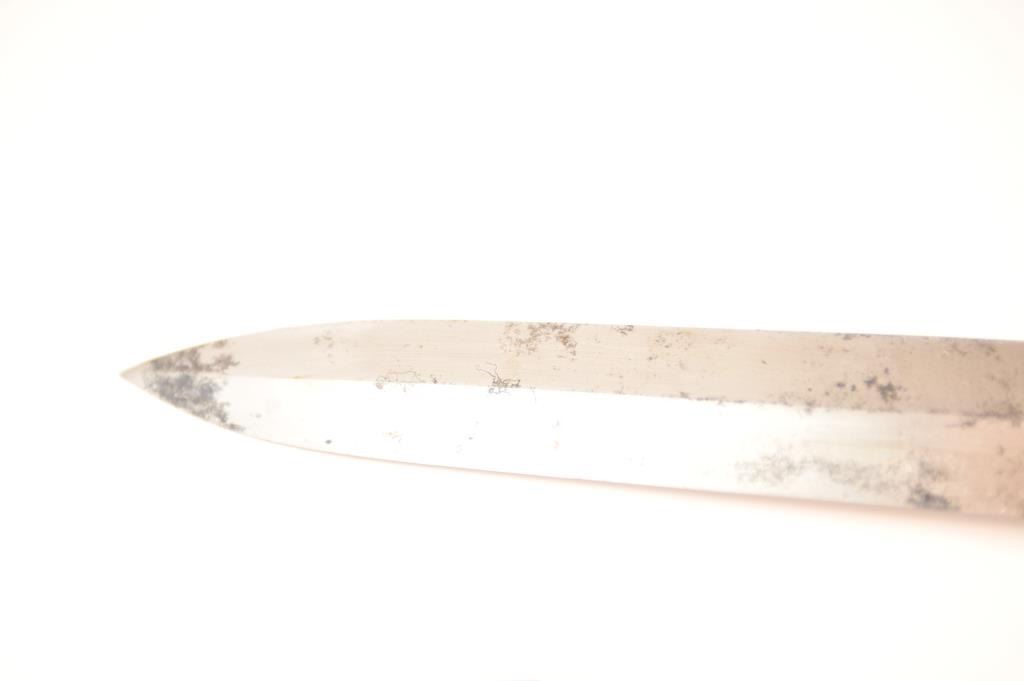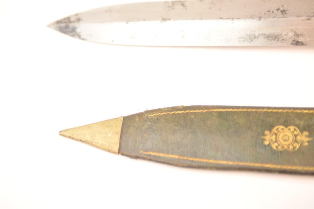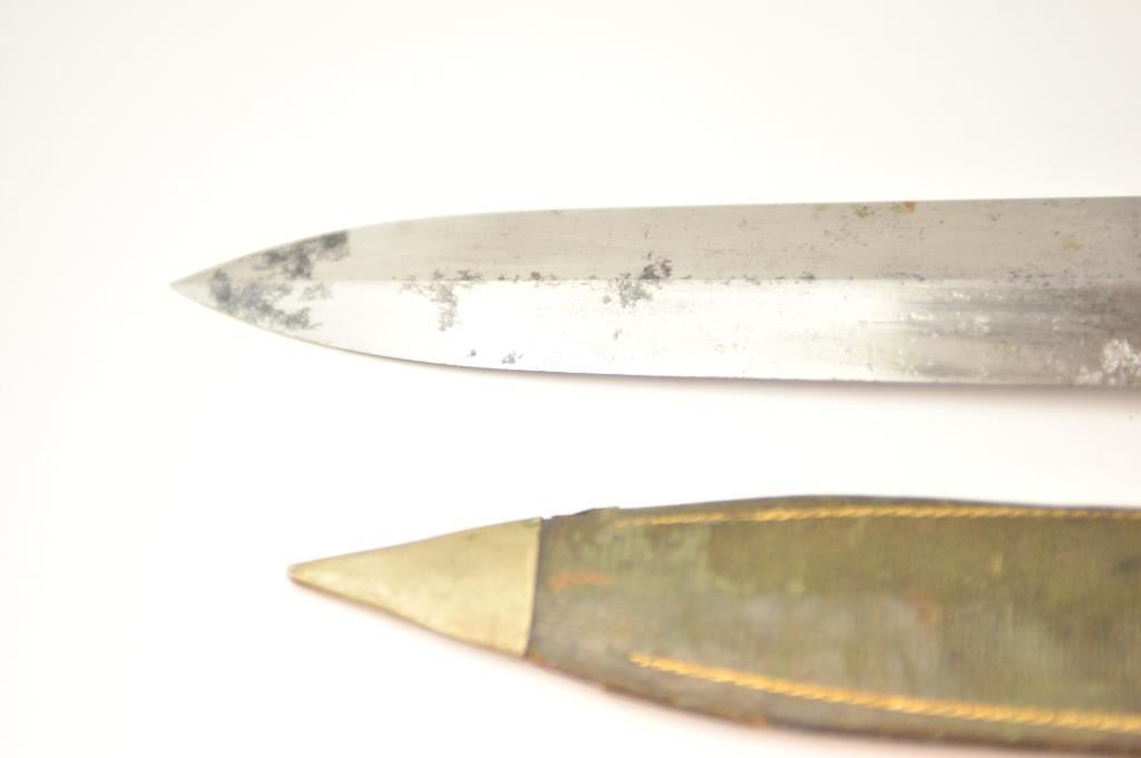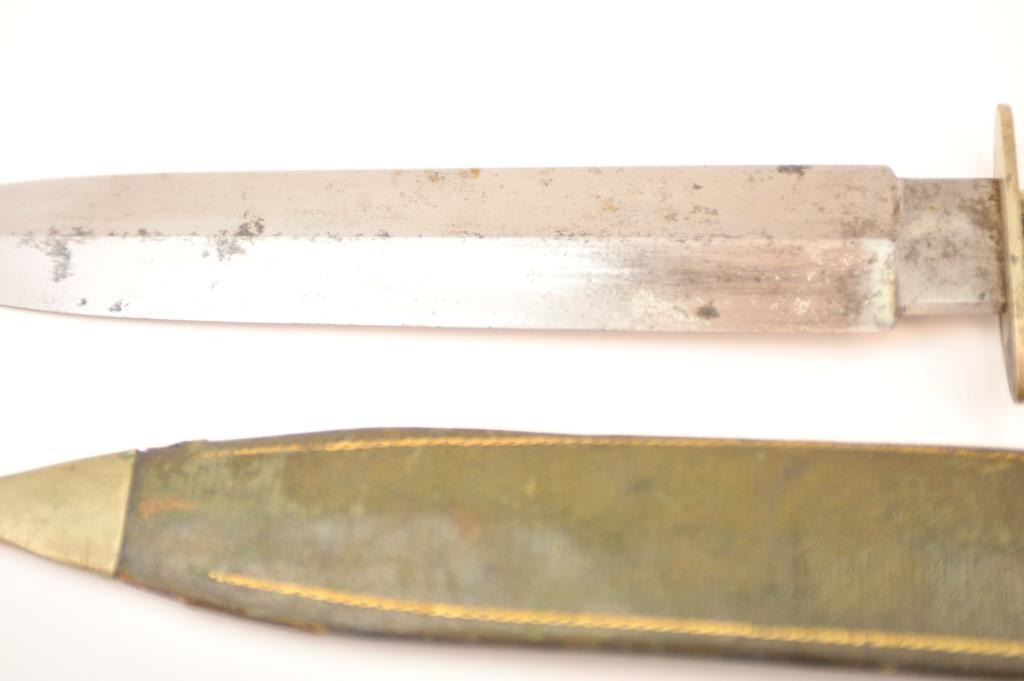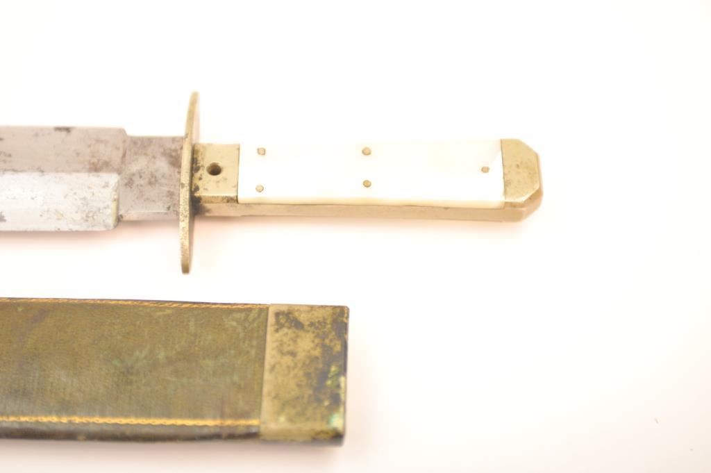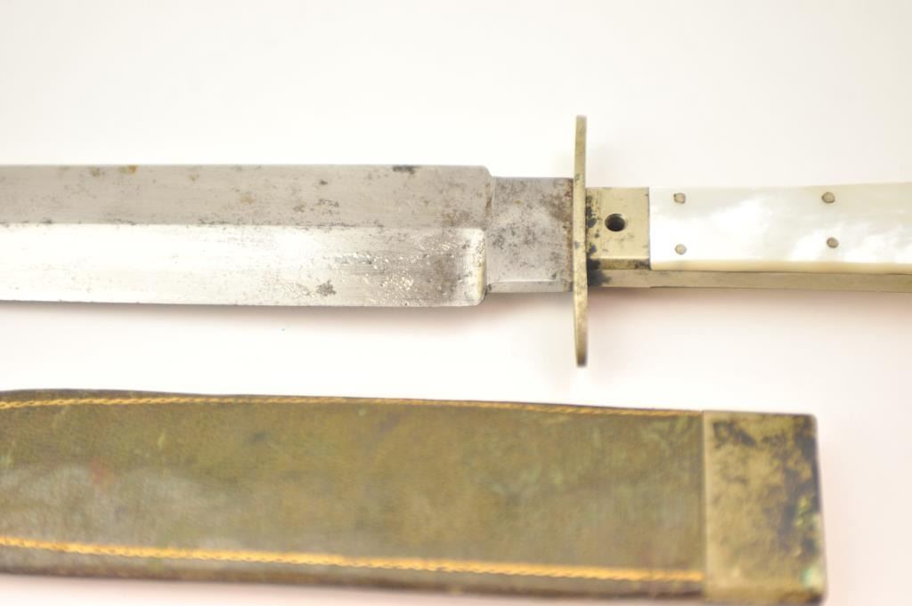 Classic and large spear point Bowie knife marked, “Joseph Hawksley’s Celebrated” with semi-coffin shaped grip with pearl scales and German silver mountings. Original scabbard with tip, throat and button hanger. Theblade measures 9 ¾” and the knife is 14 ¼” overall. The blade measures 1 ½” wide at the thickest point and is finely ground from thick stock. The blade is good to very good with scattered erosion and minor pitting butfull original dimensions with considerable original polish. The scabbard is also good to very good with minor aging. The pearl scales are near fine. There is a hole through the front bolster behind the guardfor a lanyard loop. A classic and high quality knife circa 1850-1870. Est.: $1,400-2,800