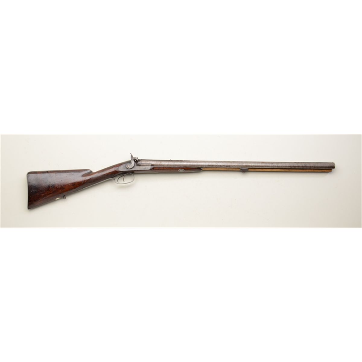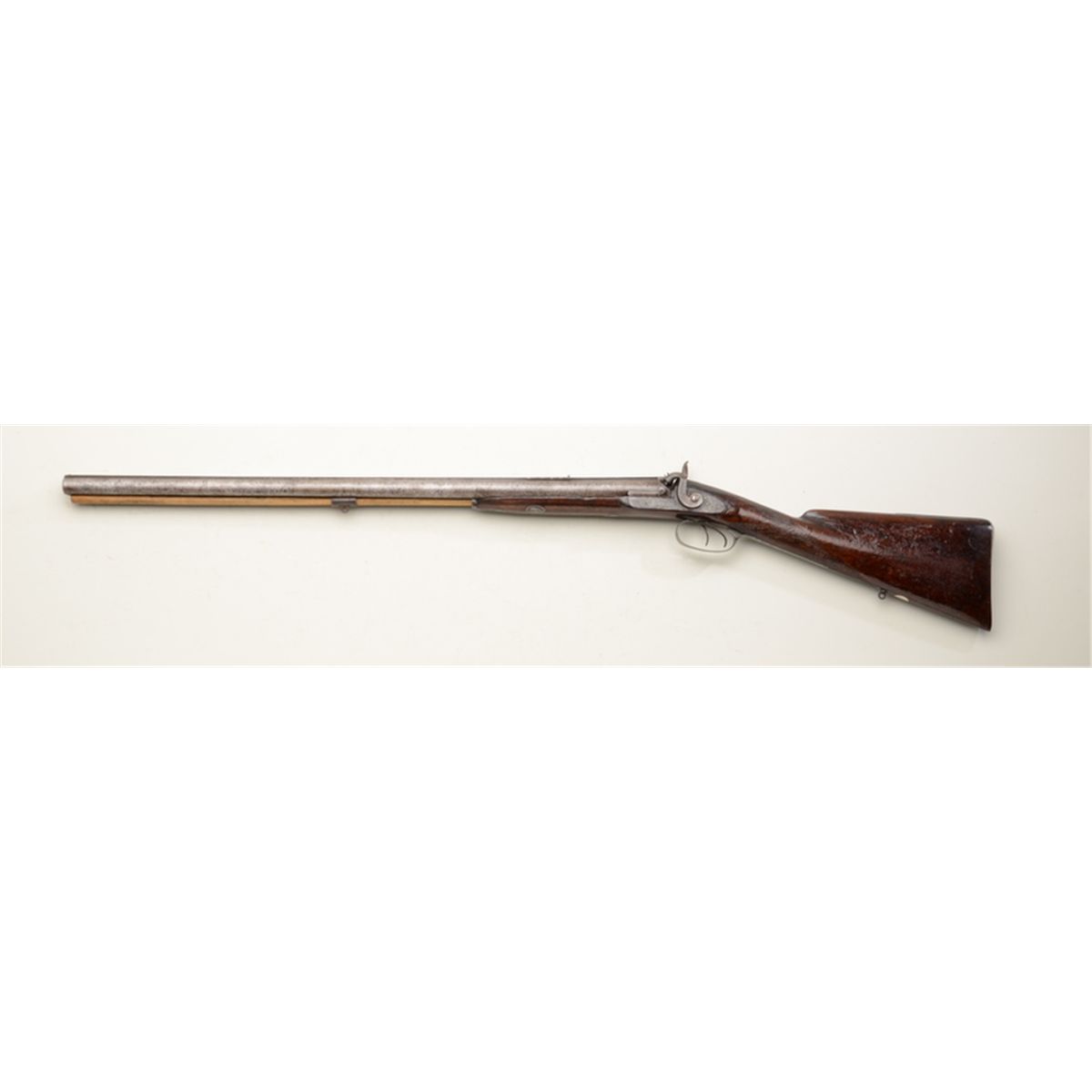 Classic cape gun signed J. Hayton on locks, with illegible inscription on barrels. Right barrel is 12ga smoothbore, left barrel is rifled, approx. .54 caliber. The gun measures 46-1/2” overall. Barrel group is 30”. Thebarrel shows a wide reinforced rib with 5-leaf rear sights and graduations all the way to the front sight which is a Marked South African feature as they paid militia men for such sighted arms. The gun is #1491on the triggerguard, the metal surfaces are good, with light to moderate scattered erosion and pitting. The stocks are fair with some losses and dings, mars, refinishing over the losses which are not slightly. Theramrod is an old replacement. The actions are good and working. A favorite of the early African settlers, especially South Africa and Rhodesia. Est: $900 - $1,800