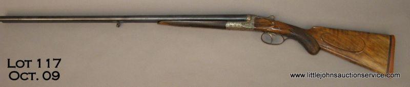 Classic early 20th Century German 20 Ga. SxS shotgun, # 18132, signed C. Grundig Master Gun Maker Dresden. The gun shows 28 ½” barrel with standard extractors, double triggers, highly engraved action, checkered pistol grip stock.The barrels and stock show quality refinish and left barrel (rear trigger) is sheared off and broken away. A fine German sporting arm worthy of restoration. Est. $800-$1600.