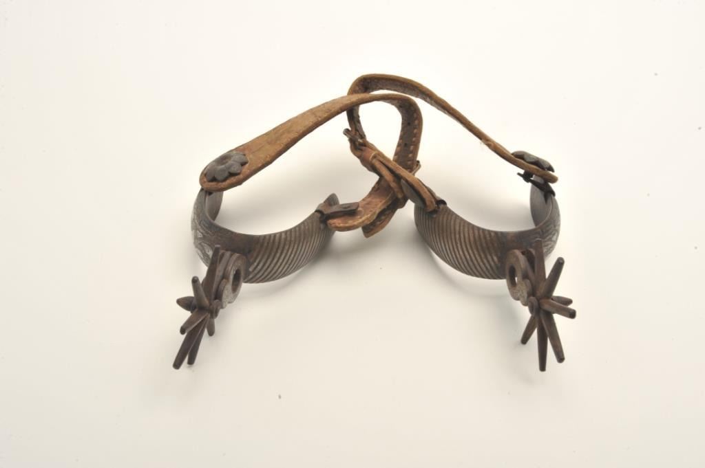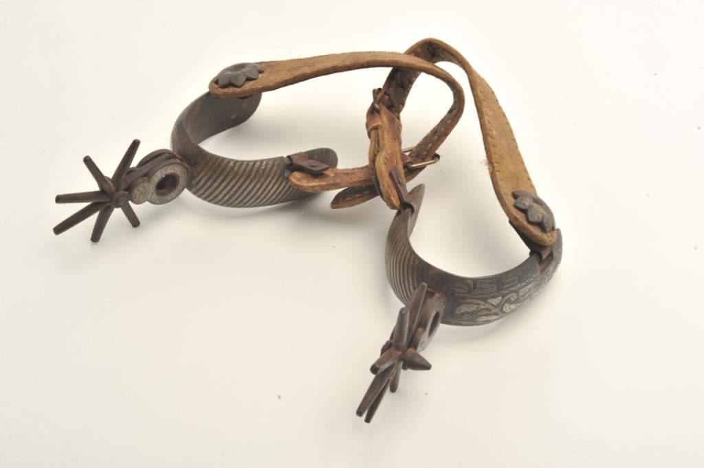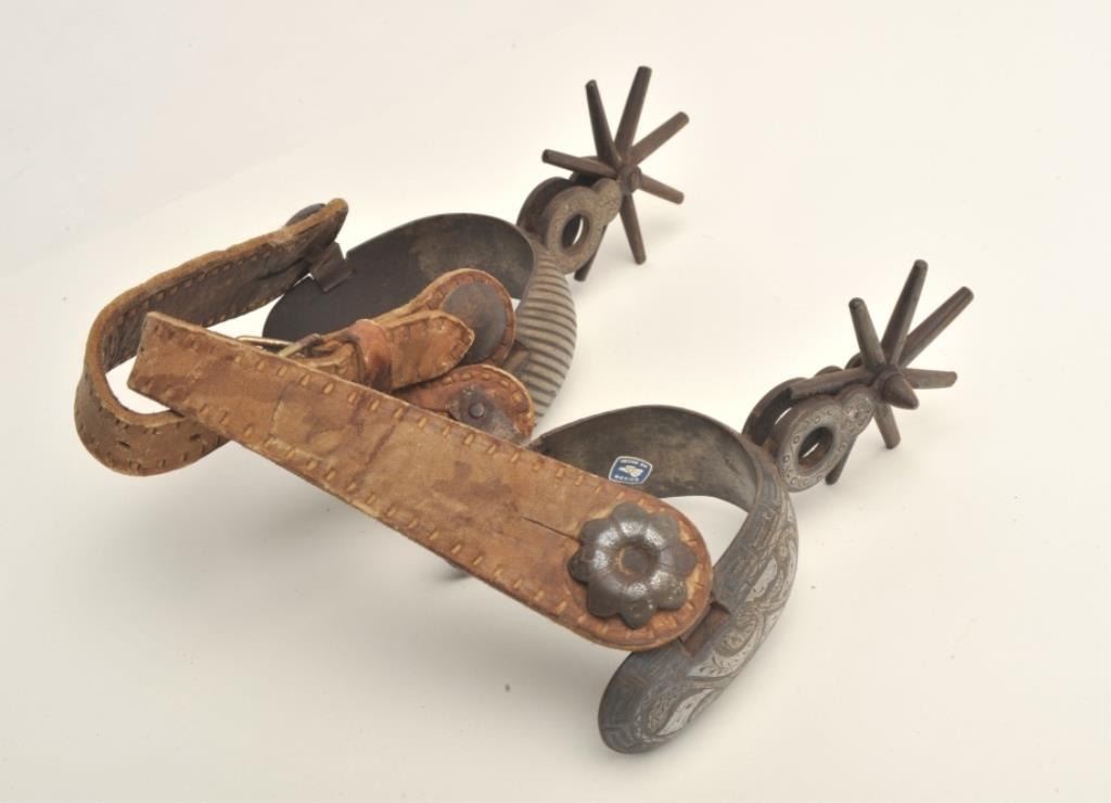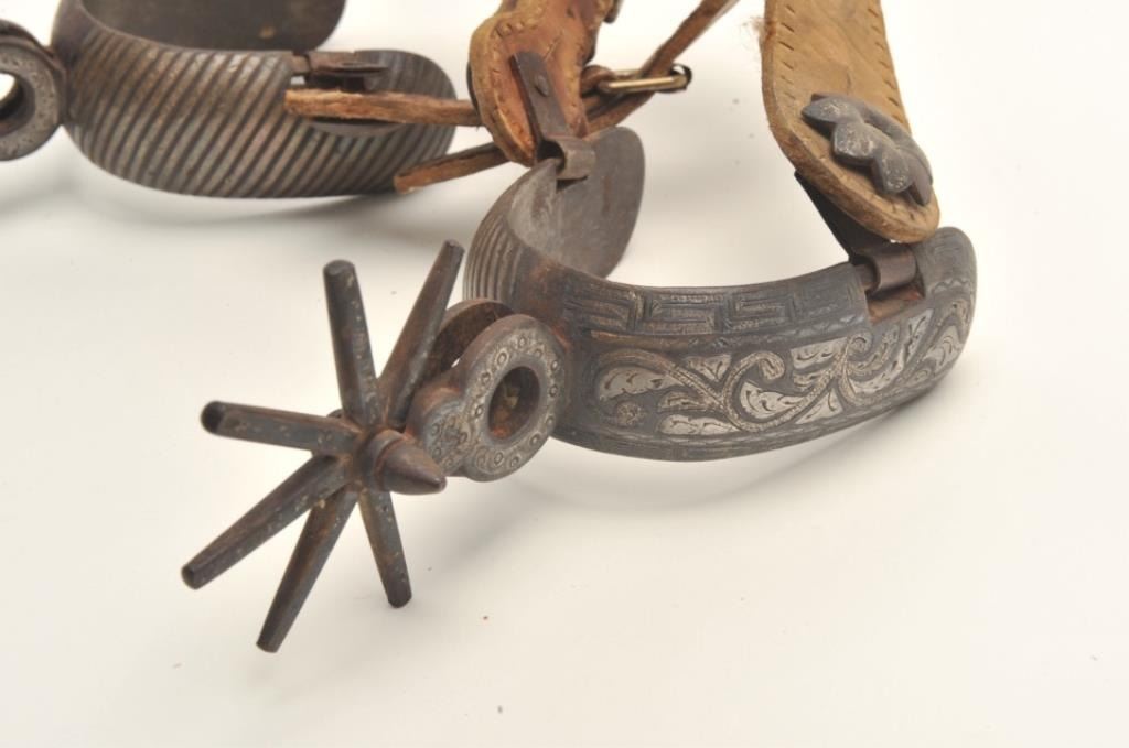 Classic late 19th to early 20th century silver inlaid Mexican spurs with their original buttons and straps. In good to very good uncleaned condition. Est.: $150-$300