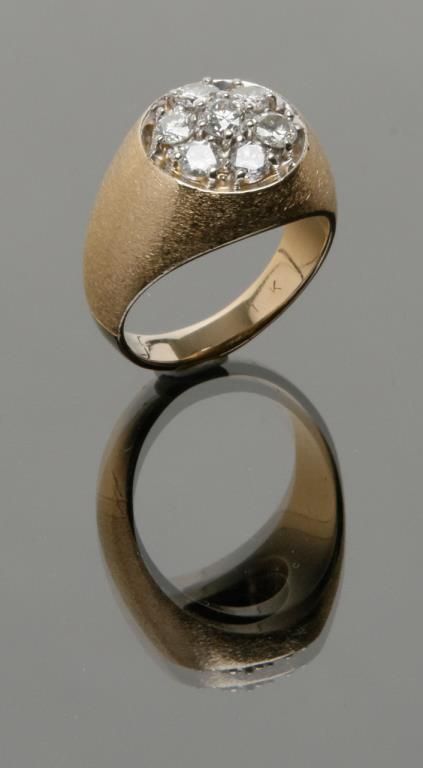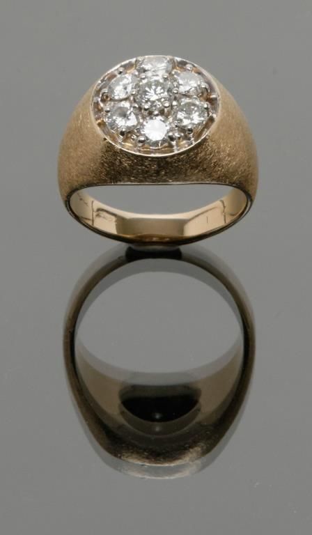 Classic man’s cluster ring set with 7 round brilliant cut diamonds weighing approximately 2 CT plus in 14K heavy gold mounting size 13. A good quality and an older piece that is signed on the interior but we cannot read the signature as it is in a fancy script and has been polished and sized over many years. Est.: $1750-$3500
