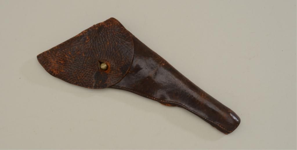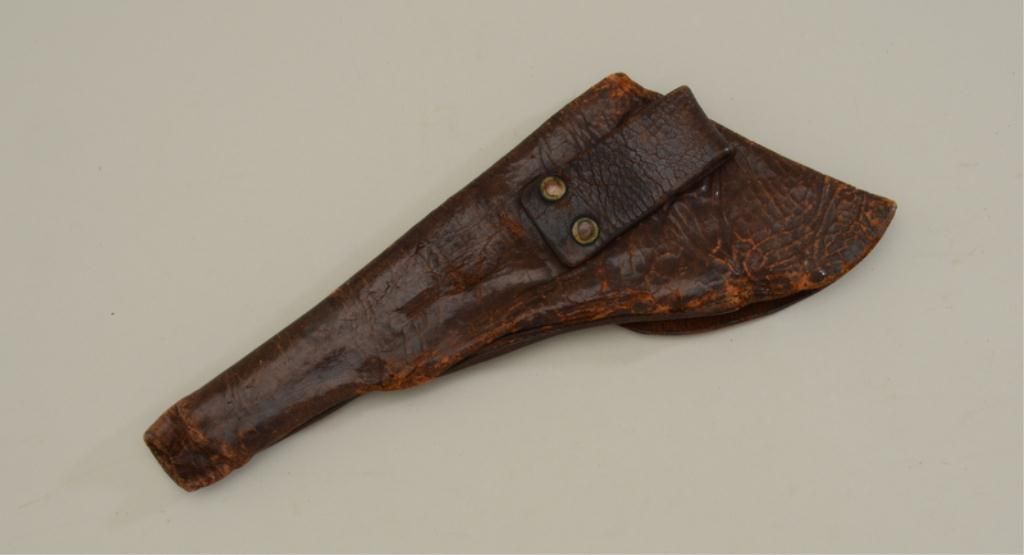 Classic military style leather flap holster for a Colt Model 1860 Army revolver in overall fair condition with crackling to flap and two rivet belt loop on the backside of the holster; great for display with a Civilor Indian War era Colt. Est.: $100-$200.