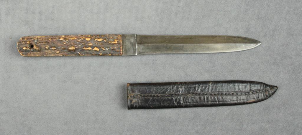 Classic old Sheffield spear point bowie style  knife approx. 9-1/2” overall with an approx.  5-1/2” blade marked “E. M. Dickinson,  Sheffield” and with simple leather sheath.  This knife is in overall very good conditionwith a grey patina on the blade and clearly  marked maker at the hilt; beautifully worn  stag handle with pinned inscription shield in  grip that is blank; hole at pommel end of  the grips to accommodate a thong or retaining cord; sheath is in overall good condition  with belt loop retained and stitching intact.   Est.:  $200-$400.