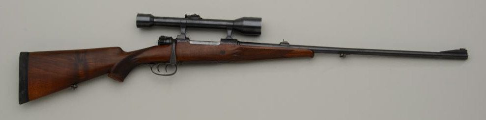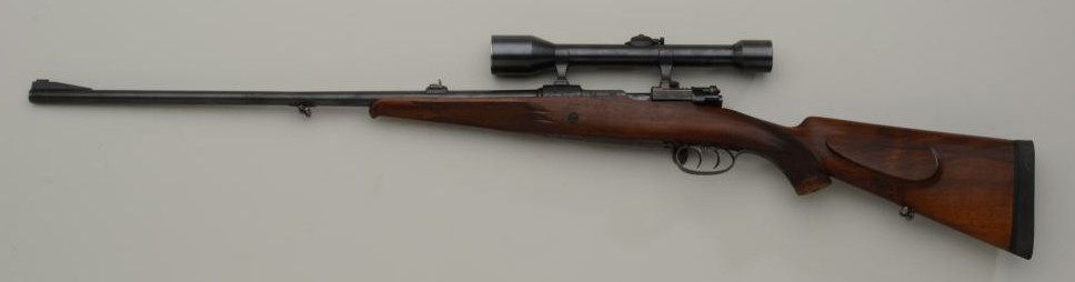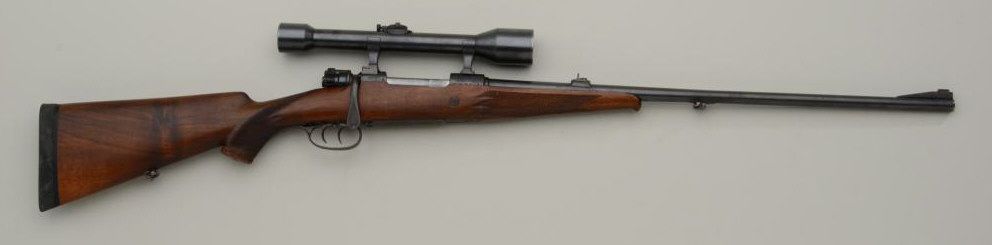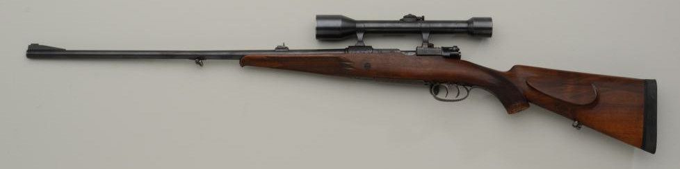 Classic prewar German sporting rifle on Model 98 Mauser action with Mannlicher type bolt handle, double set triggers, nicely checkered select walnut stock with right-hand cheek piece, folding two leaf iron rear sights,mounted with a prewar German scope by Zeiss numbered 6116 on high rise look through mounts on quick detachable claw bases. The action and trigger guard are lightly scroll engraved in German motifs. The gun is in 8mmbore but not marked for S or J bore and should be slugged before firing. Included is a prewar .22 caliber conversion unit fitted to this rifle. The rifle remains in very good condition showing 75% to 85% original bluewhich is toning and aging nicely with some slight scratches and just beginning normal age. The stocks are very good showing refreshing to the checkering and light refinishing. The rifle has been fitted with a hard rubber modern recoil pad and shows European type sling swivels. Stock measures 13 7/8” to the end of the wood and nearly 15” to the end of pad. The scope shows a military type 3 thick post with center arrow