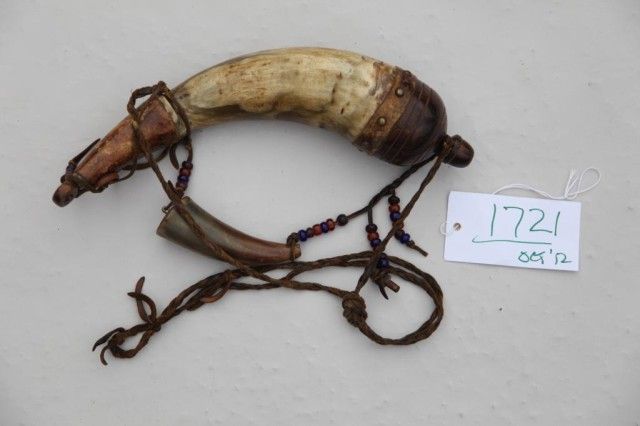 Classic style powder horn and small priming horn set with old leather thong strap; the horn is approx. 12” overall with leather wrapped neck with wood stopper and brass tacks along with large wood end piece andleather trim that is also brass tacked; priming horn is approx. 4” overall with multi-colored beads on connecting leather hangers. Est.: $200-$400.