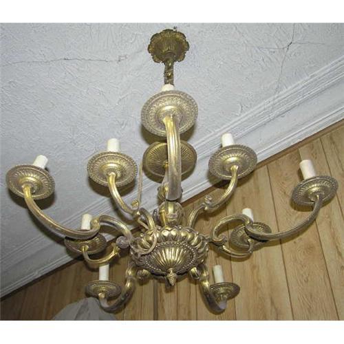 This fine old 10-light chandelier of solid brass or bronze measures approximately 30" wide and 24" high. It features all original parts, including an exceptional ceiling plate and uniquely designed chain. Its design is primarily neoclassical, with acanthus leaves decorating each candle ring, ceiling plate and spine which ends in an acorn finial at bottom. We can re-wire for an additional $600. This item resides on the upper east side of Manhattan in New York city, and may be seen in person by appointment. Thanks for visiting. Please let us know if you have any questions or comments.