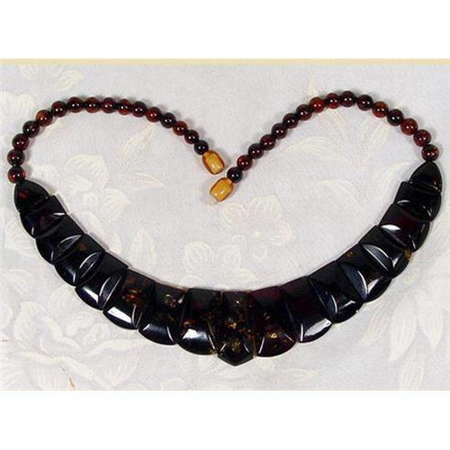 This unique amber necklace is of phenomenal quality as the photos so clearly illustrate. The artist has designed this choker to fit perfectly for the ambers are all on a curve with a length of approximately 16.5". The center plates measure 27x13mm and finished to perfection with 8mm cognac beads. Fashioned by the world famous factory in Kaliningrad Russia. There is slight damage to the back of the necklace but would never effect the durability or wear. (a-111)