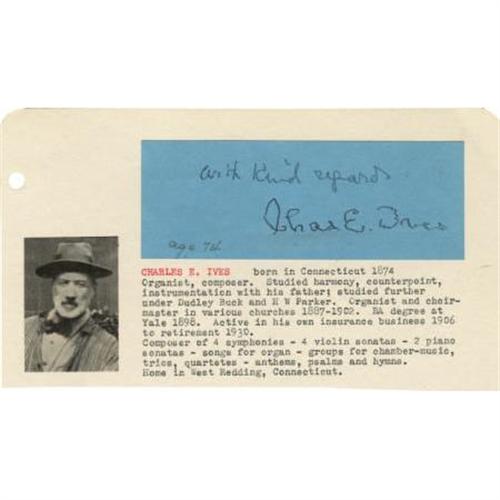 <B>Charles E. Ives Signature</B></I> "<I>Chas. E. Ives</B></I>" in a shaky old-age script in ink on a 5.5" x 2" blue card. Above the signature is added "<I>With Kind Regards</B></I>" (likely written by his wife). Ives (1874-1954), though little appreciated during his lifetime, is now regarded internationally as one of the great American classical composers of the 20th century. Very fine condition, mounted to a larger card with a typed biography and a magazine photo.<BR><BR><b>Shipping:</b> Flat Material, Small (<a target="_blank" href="http://www.heritageauctions.com/common/shipping.php">view shipping information</a>)