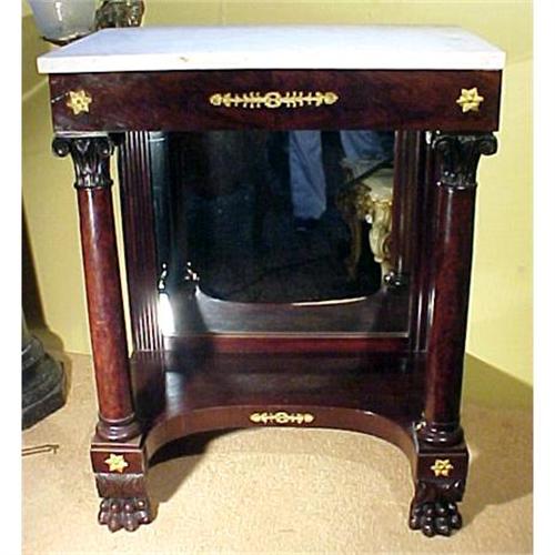 Here is an absolutely handsome 19th century marble top pier table made of highly figured mahogany with a marble top and mirror back. It is elegantly mounted with ormolu or bronze Dore classical decoration. I hope you can see the front feet of this console which are bolded carved paws. It is toped off with ionic classical column tops. The surface patina is exceptionally rich and mellow. The condition is good. This is a fine piece of America classical furniture. It measures 30 ¼?w x 37 ¾?h x 18 ¾? deep.