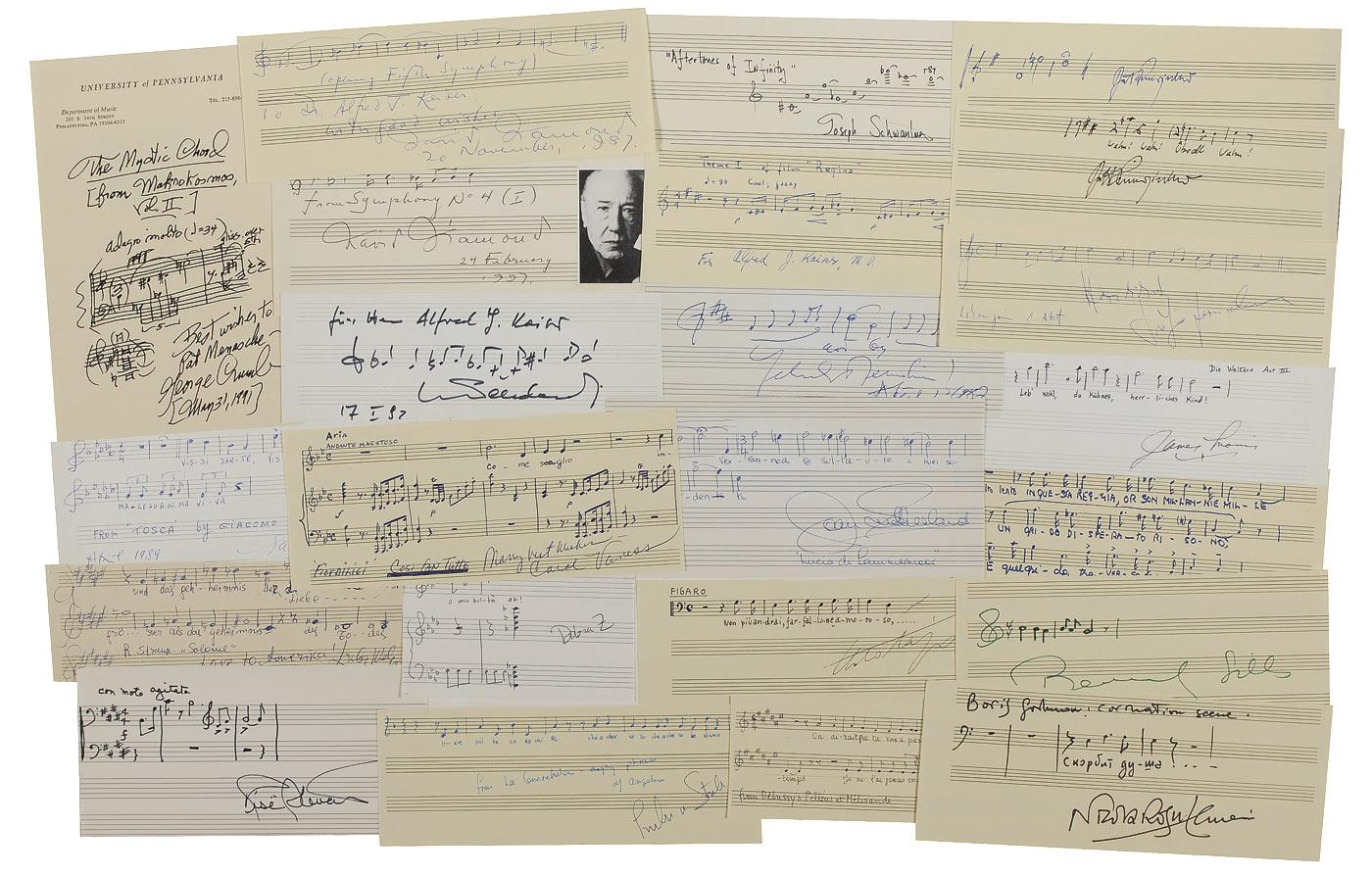 Collection of 80 AMQSs from some of the great singers, conductors, composers, and instrumentalists of the 20th century. Composers are: Paul Creston, George Crumb (”Makrokosmos: The Mystic Chord”), David Diamond (2: openings of “Symphony No. 4” and “Symphony No. 5”), Ross Lee Finney, Carlisle Floyd, Lukas Foss (2), Hans Werner Henze, Lee Hoiby, Otto Luening, Nikolai Lopatnikoff, Thea Musgrave, Krzysztof Penderecki, Joseph Schwantner, Robert Stolz (”Zwei Herzenn im 3/4 Takt”); Conductors are: Semyon Bychkov, Richard Bonygne, Jesus Lopez Cobos, Sergiu Commissiona, Christoph von Dohnanyi, Charles Dutoit, Boris Goldovsky, Raymond Harvey, Erich Leinsdorf (Beethoven’s ‘String Quartet, Op. 59, No. 1’), Loren Maazel, Charles Mackerras, Kurt Mazur, Julius Rudel, Gerhard Schwarz, Leonard Slatkin; Instrumentalists are Paul Badura-Skoda, Yo Yo Ma (2), Yehudi Menuhin (Beethoven’s ‘Violin Concerto’), Issac Stern; Singers are: Licia Albanese (2), Francisco Araizo, Rose Bampton, Kathleen Battle, Teresa Berganza, Carlo Bergonzi, Lili Chookasian, Regine Crespin, Jose van Dam, Helga Dernesch, Dietrich Fisher Dieskau (2: including Wagner’s ‘Die Meistersinger von Nurnberg’) Ghena Dimitrova, Mirella Freni, Susan Graham, Haken Hagegard, Marilyn Horne, Hans Hotter, Siegfried Jerusalem, Dorothy Kirsten (Charpentier’s ‘Louise’), Gary Lakes, Christa Ludwig, Johanna Meier, Robert Merrill, Zinka Milanova, Sherrill Milnes, James Morris, Birgit Nilsson (Wagner’s ‘Tristan und Isolde’), Jarmila Novotna, Magda Olivero, Ruggero Raimondi, Samuel Ramey, Nicola Rossi-Lemeni, Beverly Sills, Martial Singher, Frederica Von Stade, Rise Stevens, Joan Sutherland (Donizetti’s ‘Lucia de Lammermoor), Italo Tajo, Gabriella Tucci, Eva Turner (Puccini’s ‘Turandot’), Carol Vaness, Ljuba Welitsch, and Dolora Zajick. In overall fine condition. An impressive and well-represented collection.