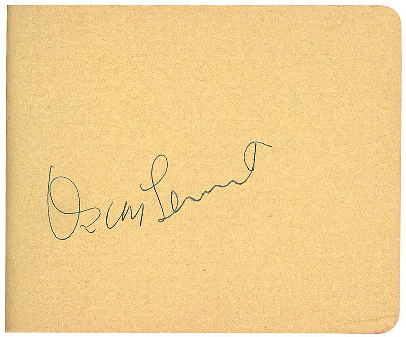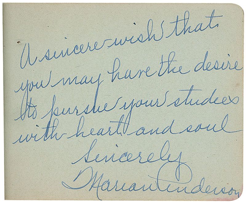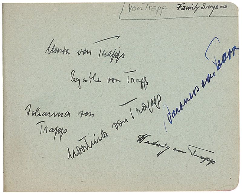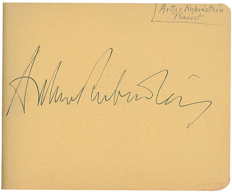 Hardcover autograph album from the 1940s, 6 x 4.5, signed inside in fountain pen by 35 composers, musicians, and performers, almost all single page, with only a couple signatures back-to-back, a few inscribed, and collector’s notations to tops of most pages. Signers include: Arthur Rubinstein, Marian Anderson, Oscar Levant, six members of the von Trapp Family Singers, Martha Lipton, Eugene List, Lotte Lehmann, Ezio Pinza, Geoffrey O’Hara, and Rise Stevens. In fine condition.