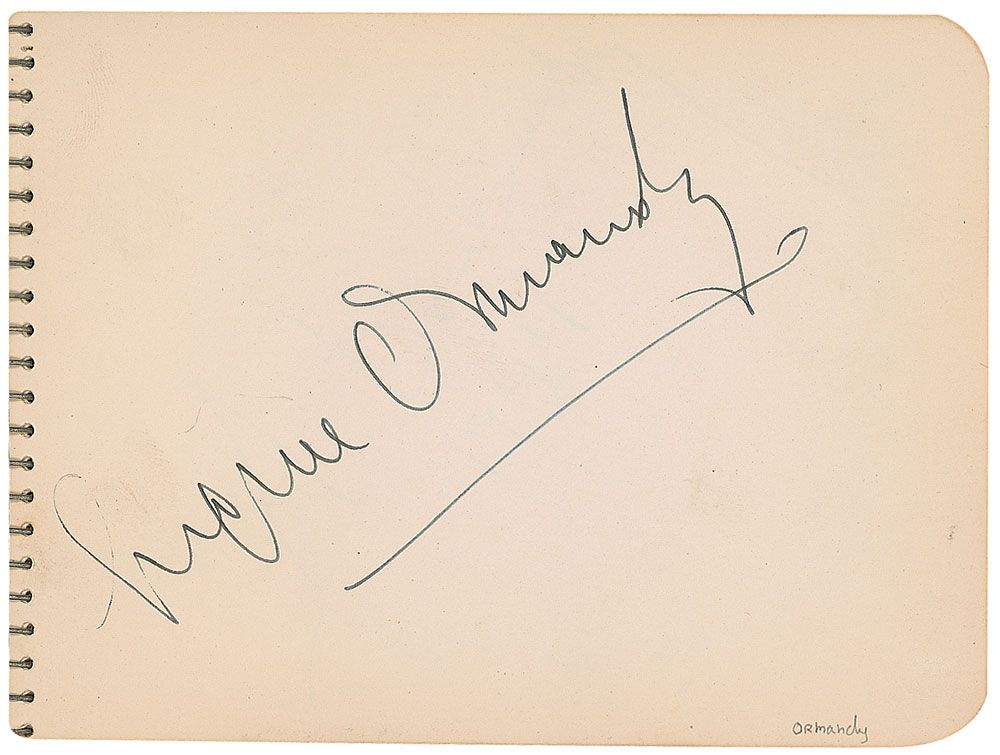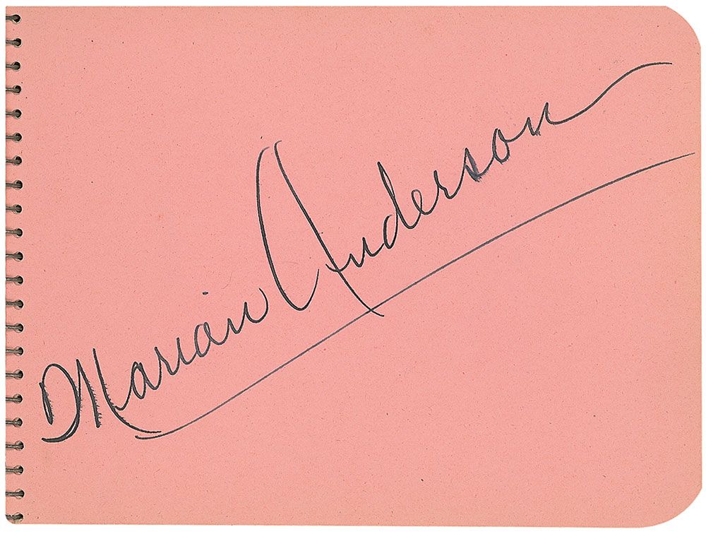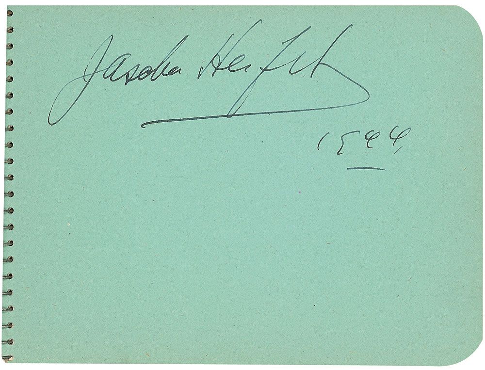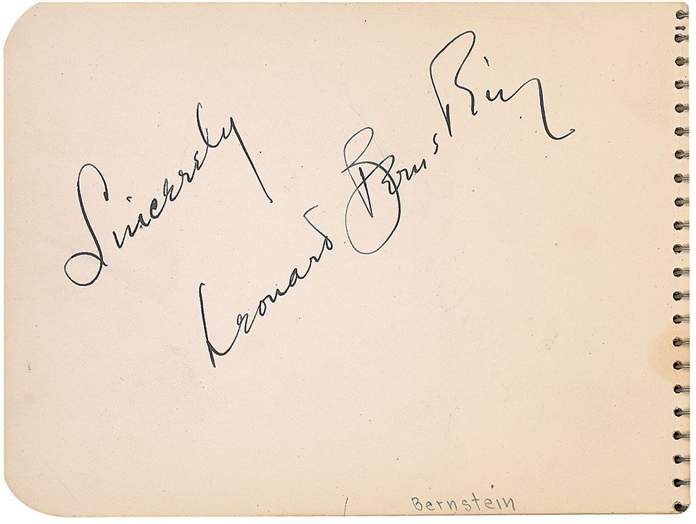 Vintage spiral-bound autograph album, 6.25 x 4.5, signed inside primarily in fountain pen (a few in pencil) by approximately 46 musicians, nearly all pages signed on a single side, with a few signatures clipped and affixed. Signers include: Leonard Bernstein, Jascha Heifetz, Eugene Ormandy, Marian Anderson, Nelson Eddy, Lily Pons, Artur Rodzinski, Mischa Elman, Alexander Brailowsky, Paul Meyer, Jan Peerce, Vladimir Dukelsky, Helen Traubel, Licia Albanese, Desi Halban, Raoul Jobin, Claudio Arrau, Leonard Warren, Cesare Sodero, Witold Malcuzynski, Karol Rathaus, Arpad Sandor, Zinka Milanov, Joseph Szigeti, Ethel Bartlett, Rae Robertson, James Melton, Ruth Posselt, Nathan Milstein, Franz Rupp, and Joseph Schuster. In overall fine condition, with some trivial soiling to a few pages and light toning to borders.