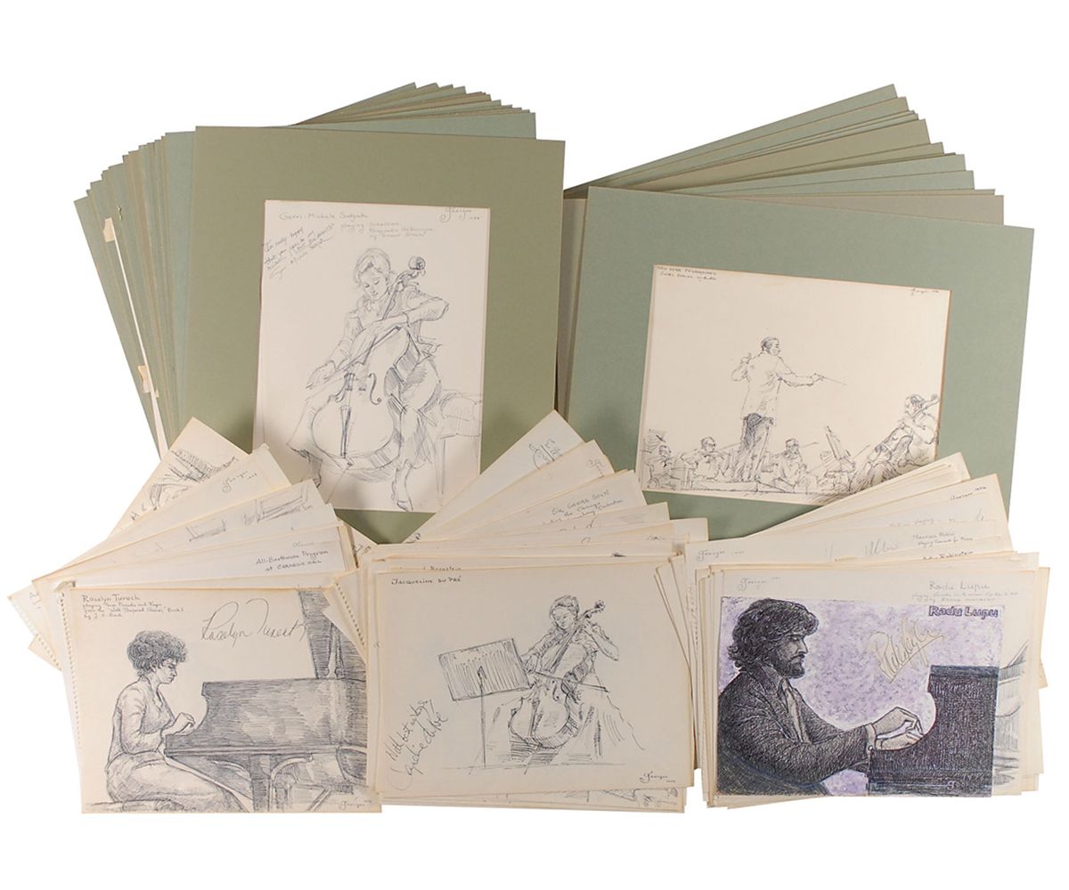 Collection of more than 1,000 original drawings of classical artists by “Georges” (né George Krishizki), each of the drawings also signed by the subject, ink on paper, most measuring 12 x 9 or 9 x 12, 1970s–1990s [the vast majority from the 1970s].