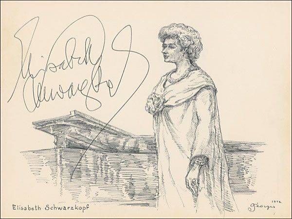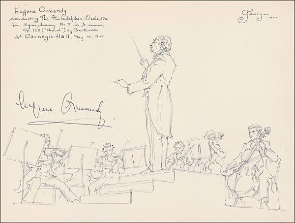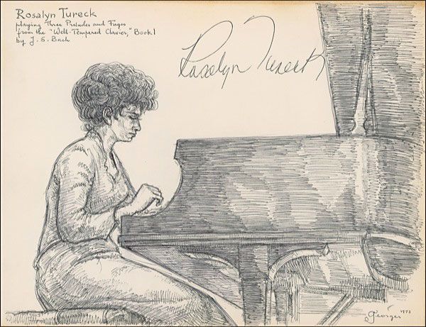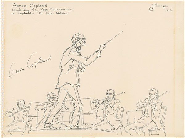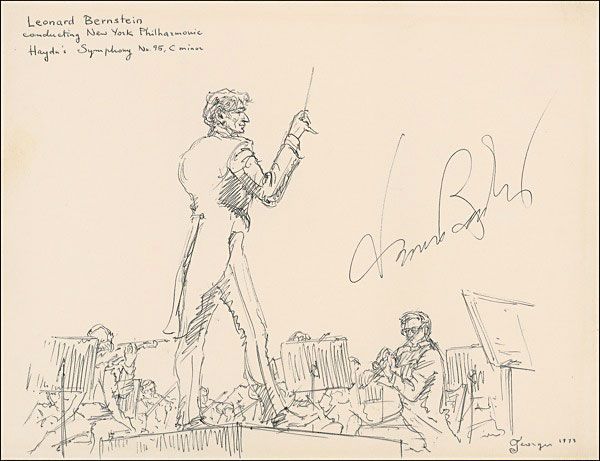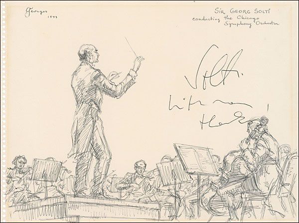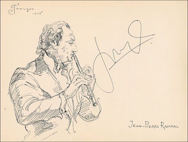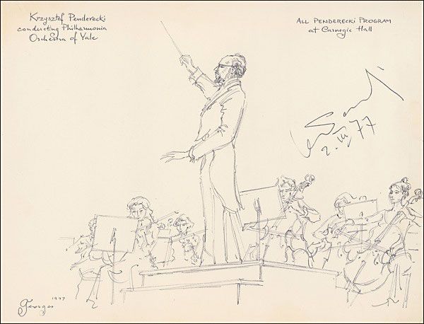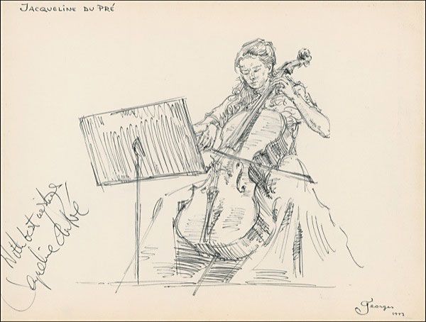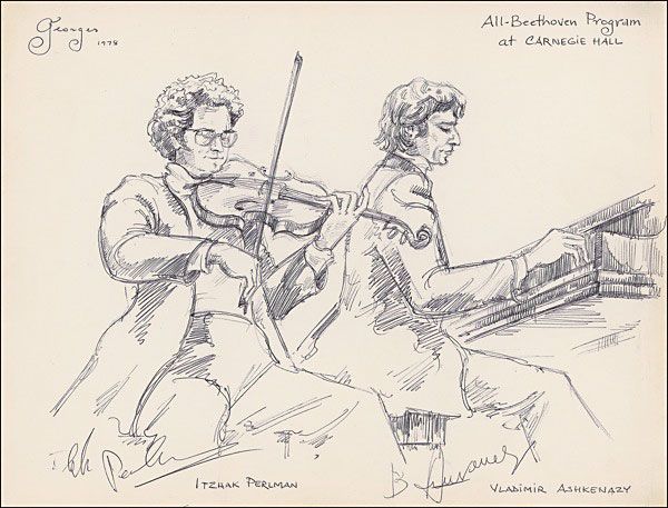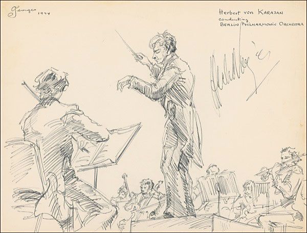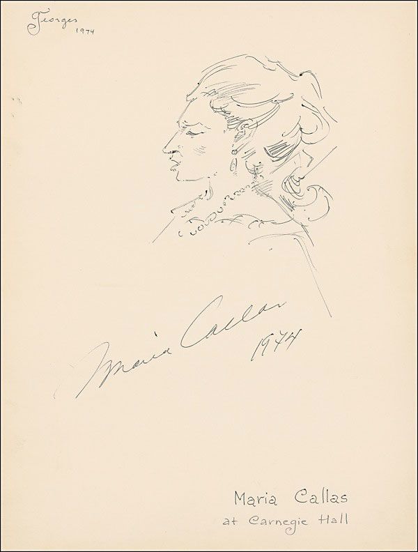 The list of Georges’s subjects reads like an honor roll of classical music in the early 1970s, with select representation by such blues and jazz giants as Duke Ellington, Count Basie, Sarah Vaughan, and others. The full spectrum of classical music is represented, including both instrumentalists (Argerich, Arrau, Bachauer, Casals, Horowitz, Menuhin, Perlman, Rampal, Rubinstein, Segovia) and singers (Bergonzi, Caballe, Schwarzkopf). A number of major composers (Barber, Boulez, Copland, Penderecki) make an appearance, as do some of the greatest conductors (Bernstein, Giulini, Karajan, Ormandy, Solti) ever to take to the podium. While the collection is rich in legends—in many cases, represented by multiple examples—ardent fans and specialists will surely recognize the special mystique and poignancy of certain names. The famed cellist Jacqueline du Pré, for example, signed her drawing in 1973—almost certainly during the last public engagements of her brief, brilliant career, which came to an untimely end in New York in February of that year due to the advancing symptoms of multiple sclerosis. Diva assoluta Maria Callas signed at Carnegie Hall in 1974, following one of the final performances of her colorful, storied, stormy career. A host of the other performers who signed earned a special place in the hearts of cultish fans who particuarly revered their interpretations of Bach (Rosalyn Tureck), Wagner (Erich Leinsdorf), or modern masters (Mstislav Rostropovich). Most of the drawings are dated, and many even include the locale and work being performed. A few are signed by multiple performers.