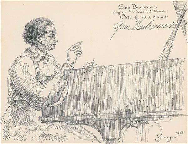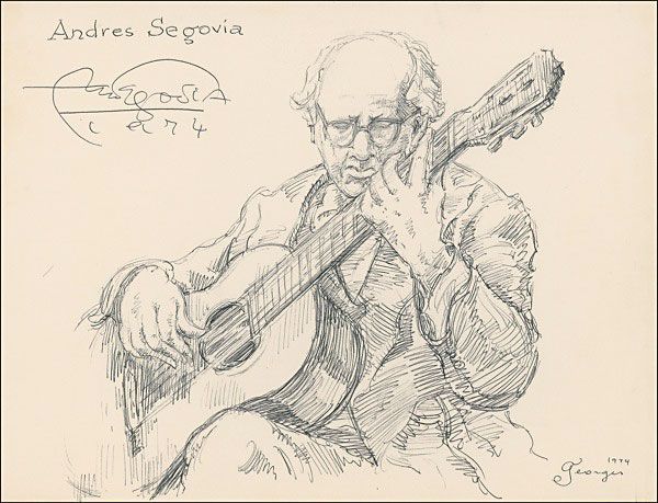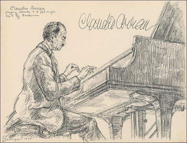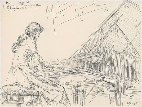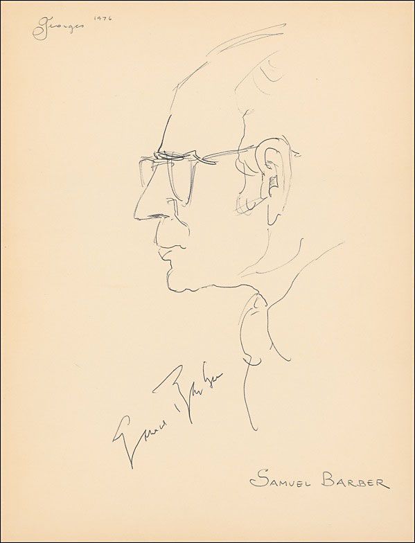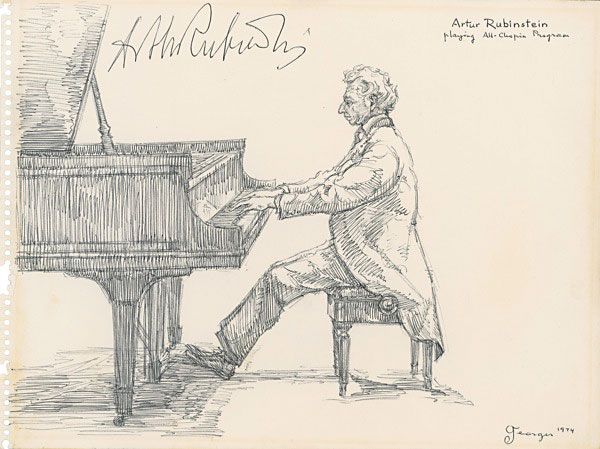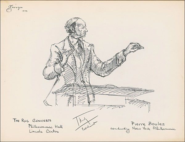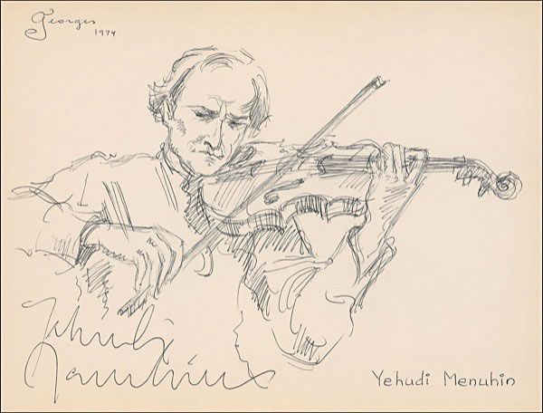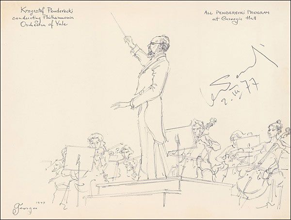 While working as a translator for the American Express International Bank Corporation, Georges continued to pursue his avocation with gusto, exhibiting his artwork at venues throughout New York City. While he earned acclaim for his renderings of the city’s architectural landmarks, it was his on-the-spot drawings of musicians in performance that attracted an especially appreciative audience. In a 1973 article published in conjunction with two simultaneous exhibitions, Georges explained the genesis of his long-running engagement with the concert hall: ‘I’ve always enjoyed going to concerts, and one day I decided it would be fun to combine my interests in music and art and make sketches of musicians during performances.’ He went on to describe the process itself: ‘First of all, [the drawings] were executed rapidly, and often under difficult conditions. The lighting in concert halls is dim. And I had to work fast, because some performers were only on stage 20 minutes.’ The ultimate stamp of approval for his efforts came from the subjects themselves: ‘The nicest compliment I ever got was from pianist Arthur Rubinstein. When I asked him to sign the drawing, he said, Often when I see drawings of myself, I feel like putting a question mark on them—but this is not the case.’