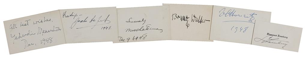 Vintage ink signatures of six classical musicians on individual off-white cards. Signers are: Yehudi Menuhin, Vladimir Horowitz, Sigmund Romberg, Mischa Elman, Jascha Heifetz, and Bruno Walter. In fine condition, with some mild toning and soiling, and a diagonal crease through Romberg’s card.
