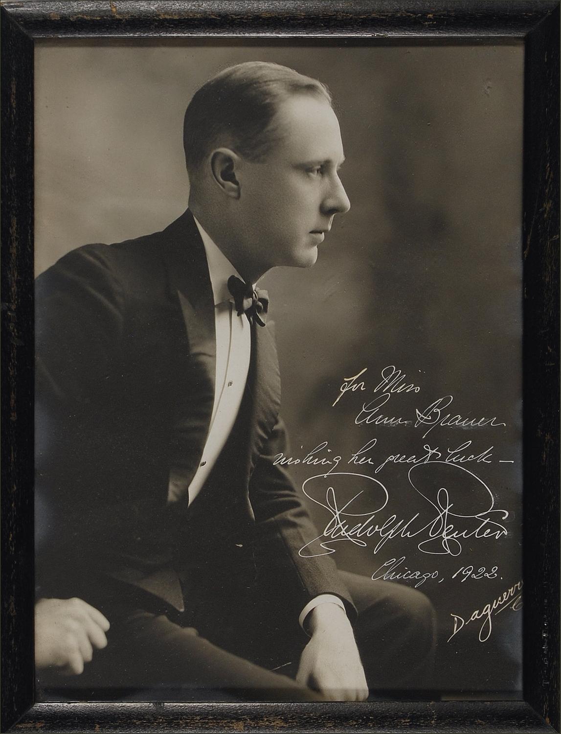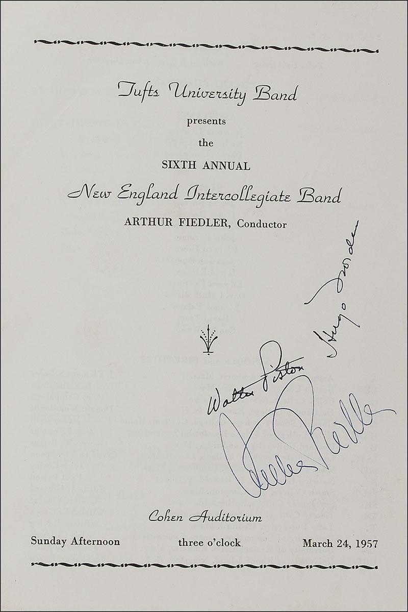 Two items: program for the Sixth Annual New England Intercollegiate Band concert, 6 x 9, held on March 24, 1957, signed on the front in blue ballpoint by Arthur Fiedler and in black ink by Hugo Norden and Walter Piston; and a 6.5 x 8.75 Daguerre studio portrait of pianist Rudolph Reuter, signed and inscribed in white ink, “For Miss Ann Brauer, wishing her great luck, Rudolph Reuter, Chicago, 1922.” Framed to an overall size of 7.5 x 9.75. In overall fine condition with scattered creasing to the program, a bit heavier at the upper left corner.