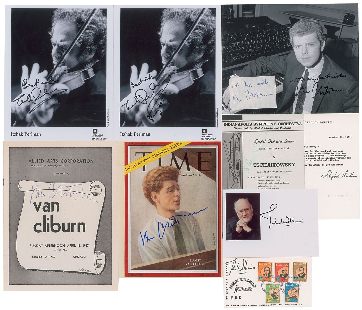 Collection of ten items signed by classical musicians and composers, including: Van Cliburn (program, signature, and two SPs), Artur Rubinstein (program), Itzhak Perlman (two SPs), John Williams (FDC and SP), and Stephen Sondheim (TLS). In overall fine condition.