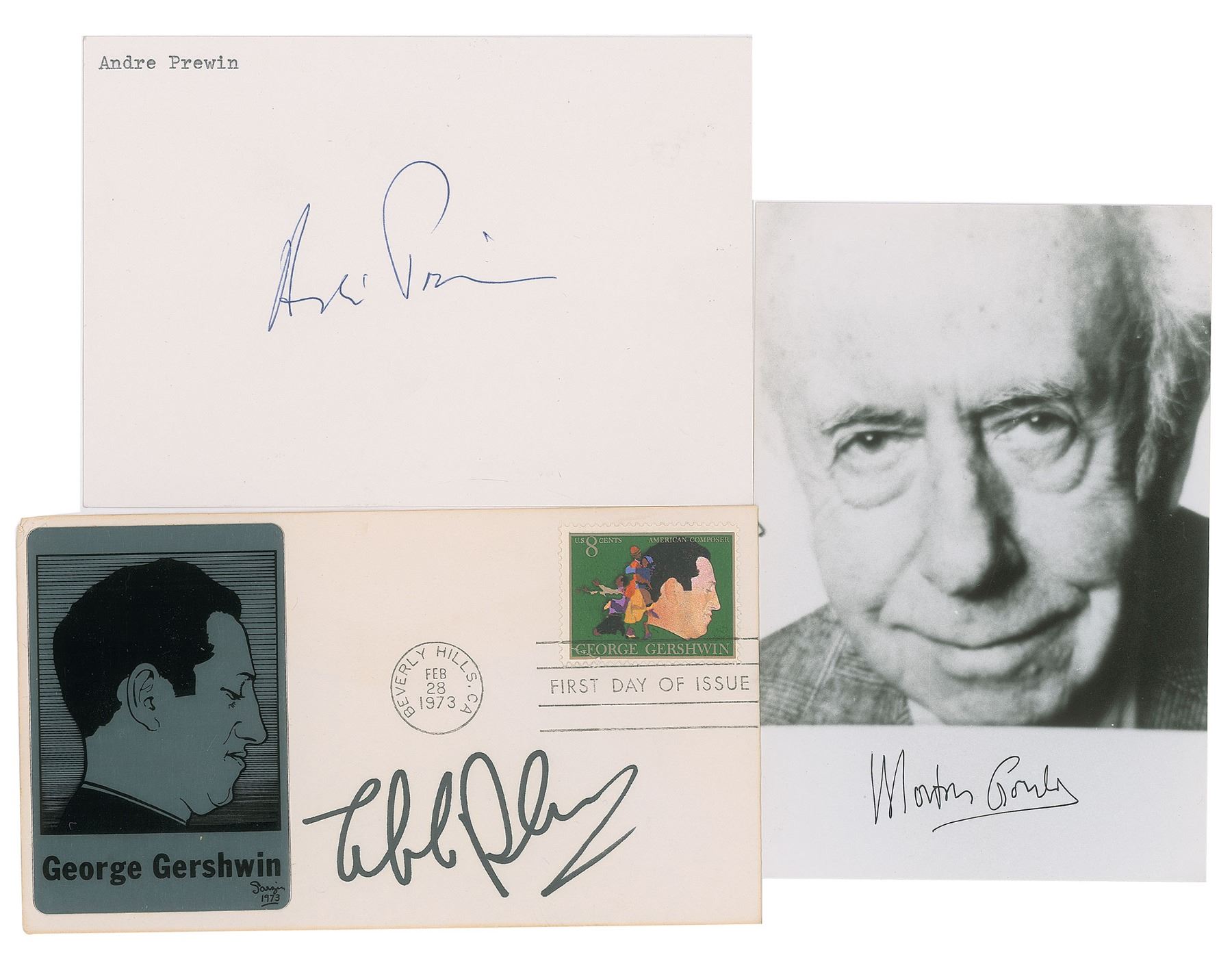 Three items signed by classical musicians: a first day cover with metallic cachet honoring George Gershwin, signed in black felt tip by Itzhak Perlman; a ballpoint signature of Andre Previn on a white 6 x 4 card; and a glossy 4 x 6 close-up photo of Morton Gould, signed in the lower border in black felt tip. In fine condition.