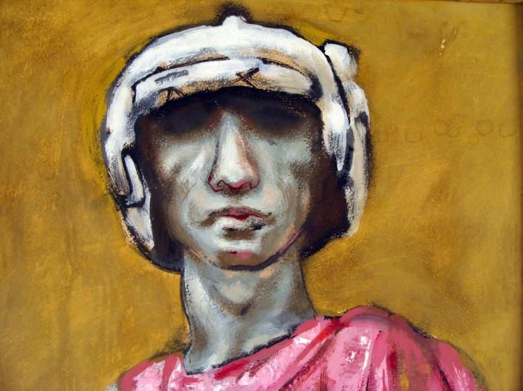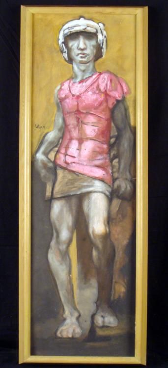 Here is a painting portraying a Roman figure, probably an athlete, ready for a game at the Colliseum. . Artist: Signed, left, center Medium: Acrylic on boardImage size: 12 x 39 1/2 inchesFraming: In mid century modern style light wood frameFrame size: 15 x 42 1/2 inchesCondition: Excellent