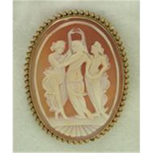 A simple twisted bezel surrounds this natural shell cameo. Hand carved in 1907, this cameo featuring three muses is a traditional design that spans 2,400 years from the Greek empire to today. The intricate detail of the cameo is an example of superb carving. Cameo is 1.38 inches wide by 1.75 inches tall. Cameos are one of the oldest forms of collectible art. The cameo process combines the artist's capabilities with the work of a goldsmith. The concept of cameos became popular during Greek and Roman times. It also became a traditional parting gift between mothers and daughters. Cameos remain today as one of the most sought after collectibles.
